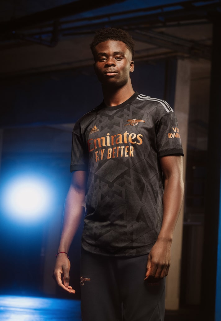 The Away then combines a bronze cannon badge and bronze metallic trims with shades of black and carbon that showcase an AFC all-over graphic inspired by the Arsenal lettering that fans pass on their way to Emirates Stadium on matchdays.