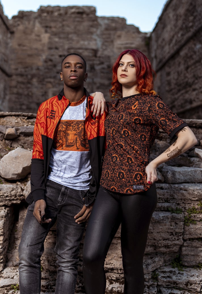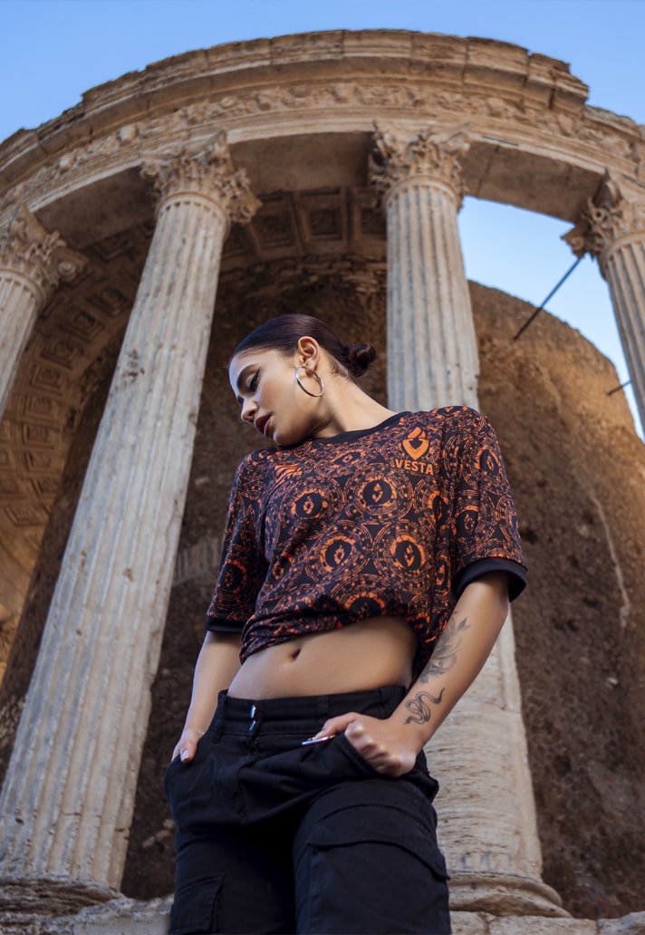 For the third shirt, the influence is the sketch of the Piranesi Architectural Temple, as drawn by the famous neoclassical architect Giovanni Battista Piranesi. The geometric pattern repeats in black across the whole orange base of the shirt. The Vesta logo is found in the centre of each circular graphic element in correspondence with the place where the sacred fire was placed in history.