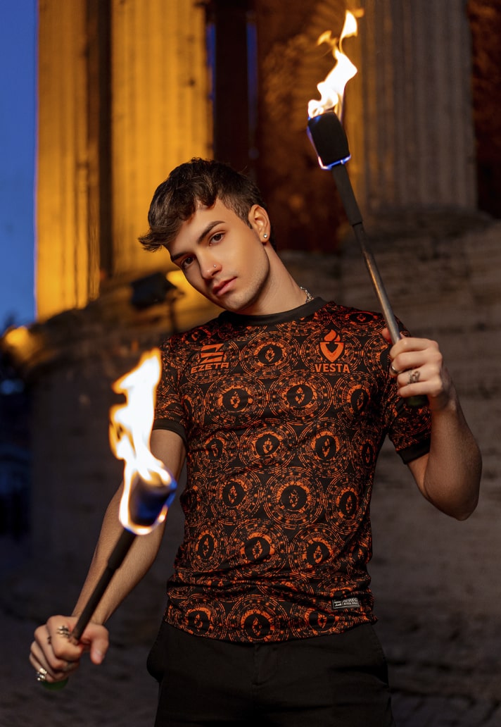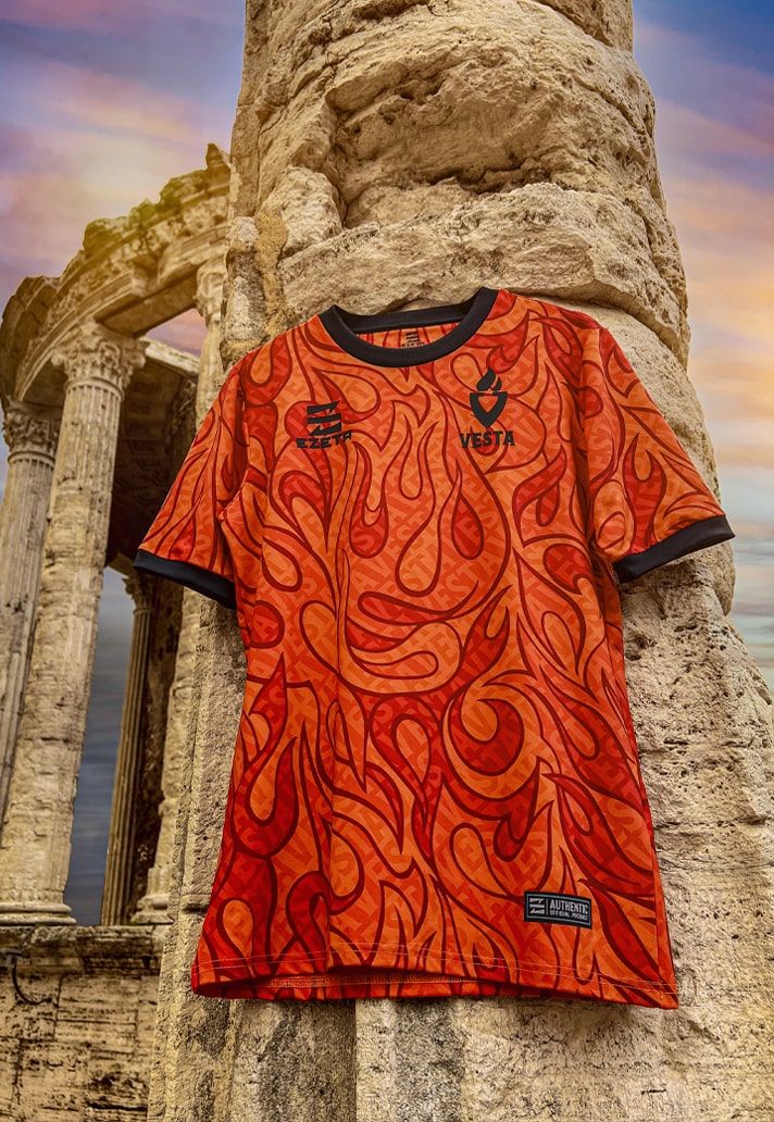 Completing the 2023 season set for non-league Italian side Vesta Calcio, Ezeta have revealed the club’s new home and third shirts, which both continue the sacred fire theme that is integral to the Vesta identity.