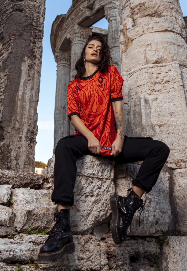 For those unaware, Vesta Calcio compete in the first division of the Lazio League in Rome. Their name is taken from the Roman goddess Vesta (naturally), goddess of the hearth, and her high priestesses had the task of keeping the sacred fire burning. And it is from here that all three designs draw inspiration. While the away shirt design was inspired by the temple dedicated to Vesta, located in Tivoli (where the photoshoot for the jersey took place, incidentally), the home shirt is more directly influenced by the eternal flame itself, that which forms the club crest. The flame design dominates the entire look, spreading across in a fiery rage, bordered on collar and cuffs by black.