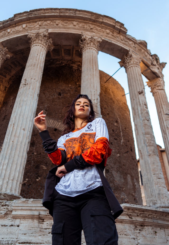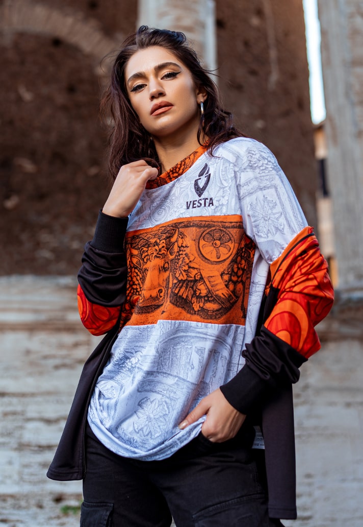 The away jersey produced for the side embraces this cult-like status of the goddess in Ancient Roman Civilisation, drawing inspiration from the temple dedicated to her located in Tivoli (where the photoshoot for the jersey took place, incidentally). It’s a building that’s full of architectural and decorative elements and these have been beautifully recreated on the jersey, in Ezeta’s trademark sublimated print style, presented in a monochrome base that’s broken up by a bright and bold orange horizontal band and collar. The numbers on the shirts are also sublimated, lending the design a tidy finish.