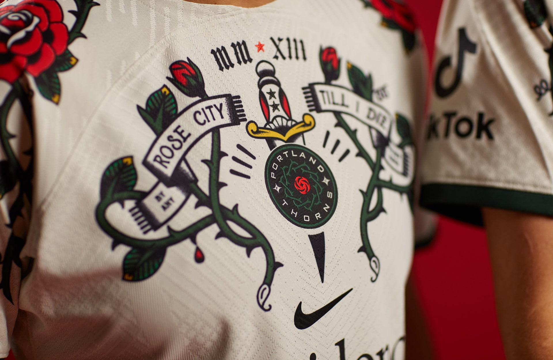 Portland Thorns have leant into their name and identity in the past for their jersey designs, and now they do so again with their new away jersey for 2023. Produced by Nike, it sees the return of the club’s Heritage mark, the original black, red and green crest that represented the club during its early seasons in the NWSL, and that’s. And for the first time in the club’s history, it takes up residence in a central position, punctuated by a dagger that sits under it, as the focal point of a unique tattoo-inspired design.
