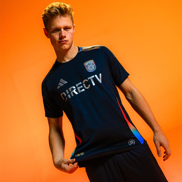 Embracing four layers of pattern featuring a subtle nod to design qualities found in Mexican blankets, the 2023 SD Loyal Away Kit displays regional cities and neighbourhoods. The vibrant orange base and Torrey Green trim represent the energy from SD Loyal fans that the players will take with them everywhere on the road.