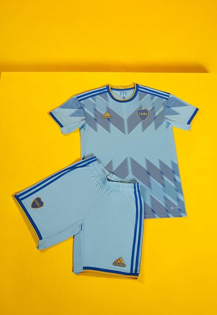 The kit sees a combination of blue hues, with a light blue base joined by royal blue accents on the collar, cuffs and Three Stripes on the shoulders. That tone of blue is combined with yellow to form Boca’s traditional colour combo. The chevron style graphic plays out on the upper and lower portion of the front of the shirt, leaving a space for the sponsor, however, Boca played in the match against Argentinos Juniors with a sponsor-less version. A small print of the bridge appears on the inside of the neck.