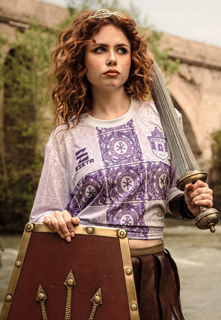 For the away and third shirts, further inspiration is taken from Constantine’s tale, and specifically from Chi-Rho, a Christian symbol used as part of the Emperor’s standard. The legend narrates that Christ appeared in a dream to Constantine and ordered him to post his symbol "Chi-Rho" sign on the shield of own soldiers, and it is this symbol (the cross with the “P” on top) that appears in each of the squares on the front of the jerseys, (violet on white for the away and gold on black for the third) combining to make the cross.