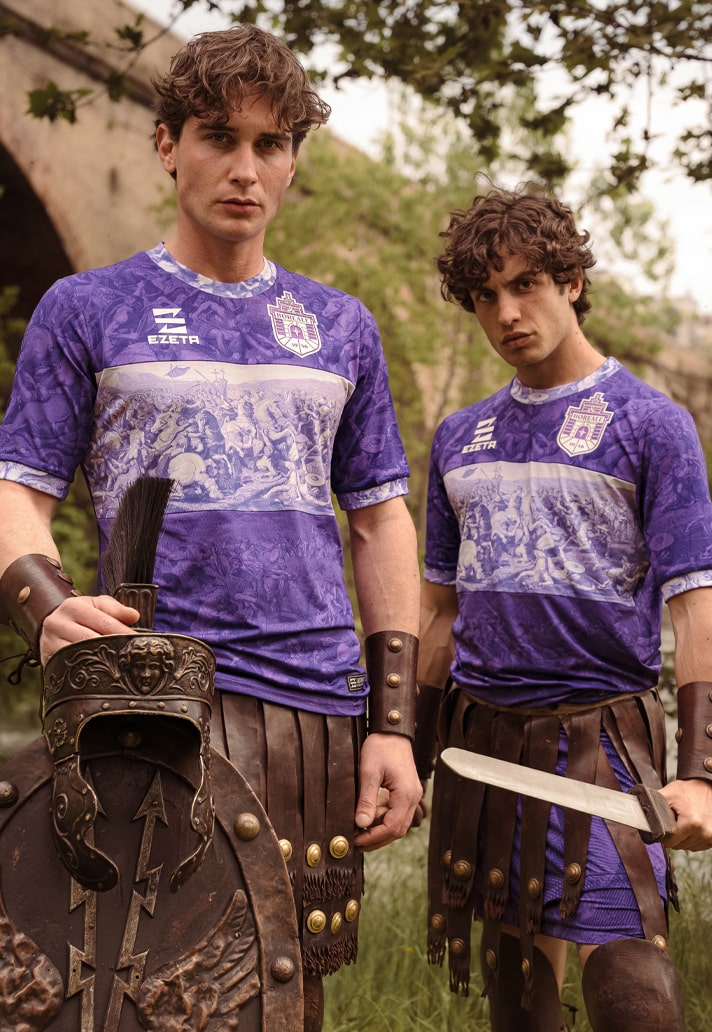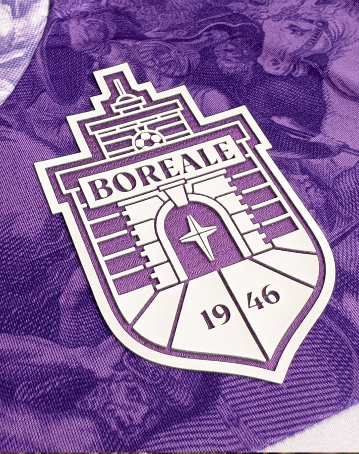 So, what we get then for Boreale are four shirt designs for the 23/24 season that are steeped in history. Split into two design templates, the violet home shirt and the red fourth (goalkeeper) shirt feature a band construction similar to the style that Ezeta implemented for Alba Roma. Here though, the shirts are a canvas upon which the famous painting of The Battle of the Milvian Bridge by Giulio Romano is sublimated into the very fabric, emphasised by that central band across the chest. The subtle switch of the colours in use on each shirt plays nicely through the collar and cuff detail.