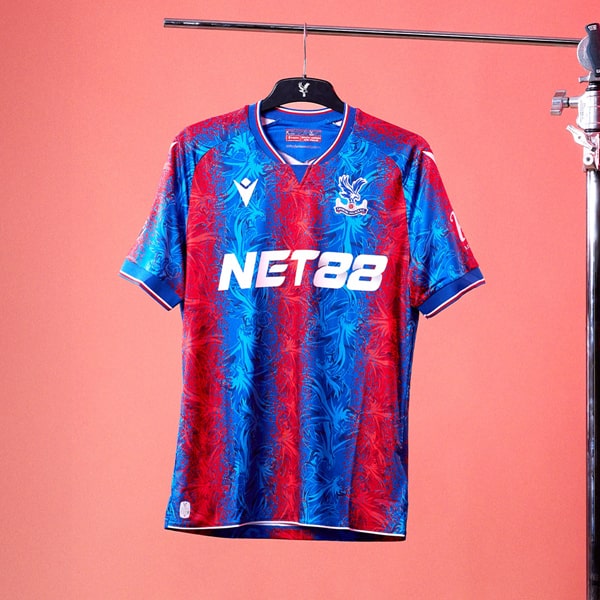 The Palace home shirt is made of a 50/50 red and blue split to celebrate the 10 year anniversary of their promotion to the Premier League. It also features a subtle sublimated silhouette of the original Crystal Palace, where the club was founded in 1861 and played from 1862. Nice touch.