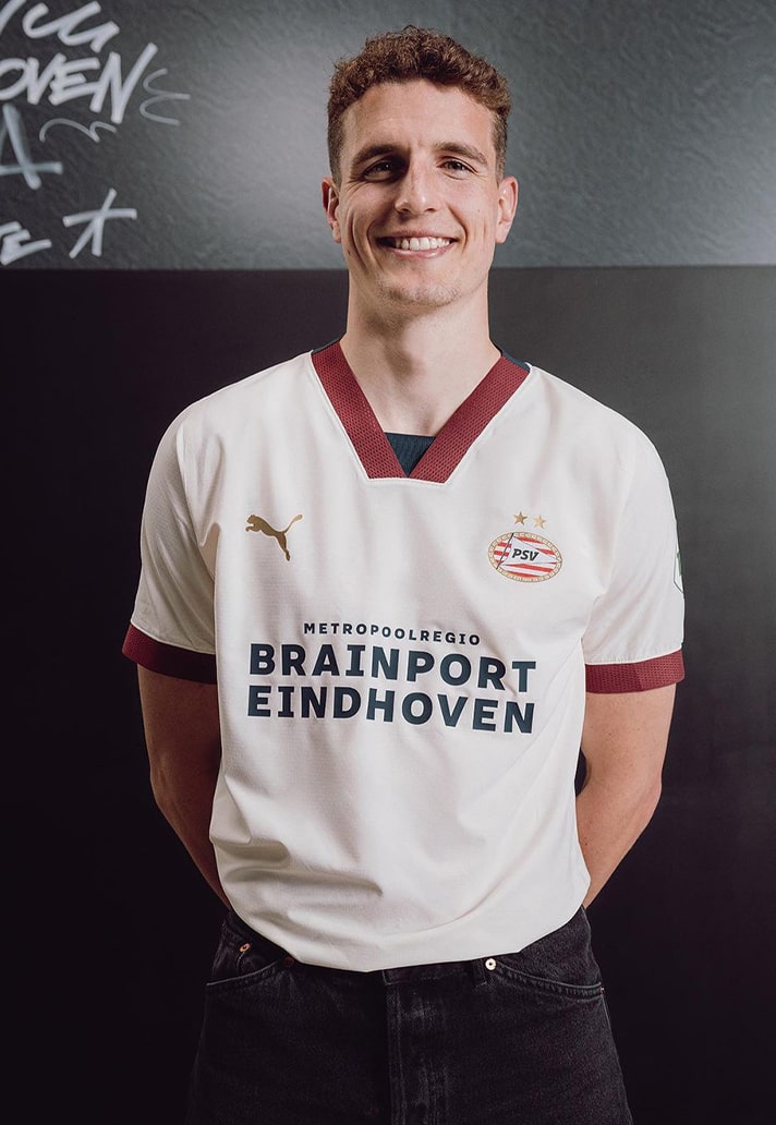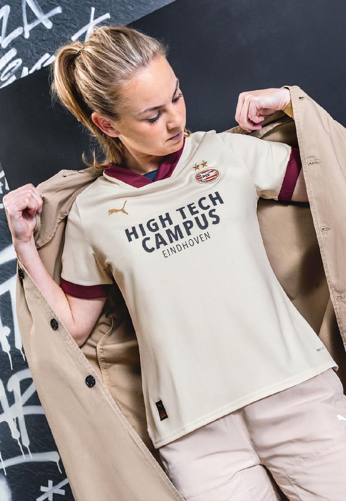 Attention turns to next season for Eredivisie side PSV Eindhoven, as PUMA launch the club’s new away shirt for 23/24. During this coming campaign PSV will celebrate its 110th anniversary, and the new away shirt forms part of the club’s celebrations, arriving in an off white ‘Champagne’ colour way that’s joined by burgundy accents in the collar and cuffs.