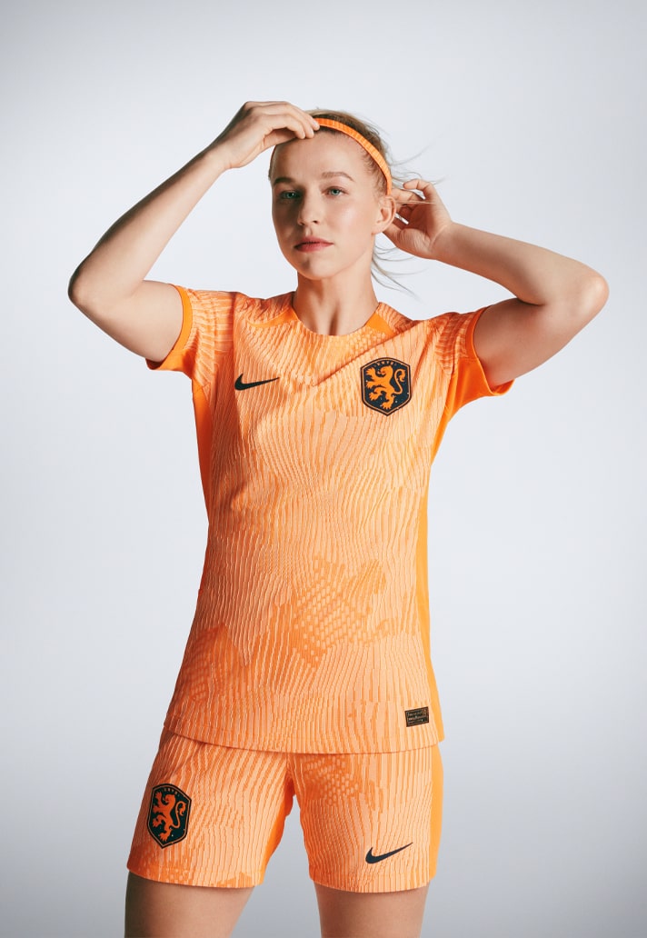 The away kit spotlights the colours of the flag, sporting blue as their primary color. Nike designers took the lioness, the Dutch women’s national team crest, and combined its shape with geometric modern patterns.