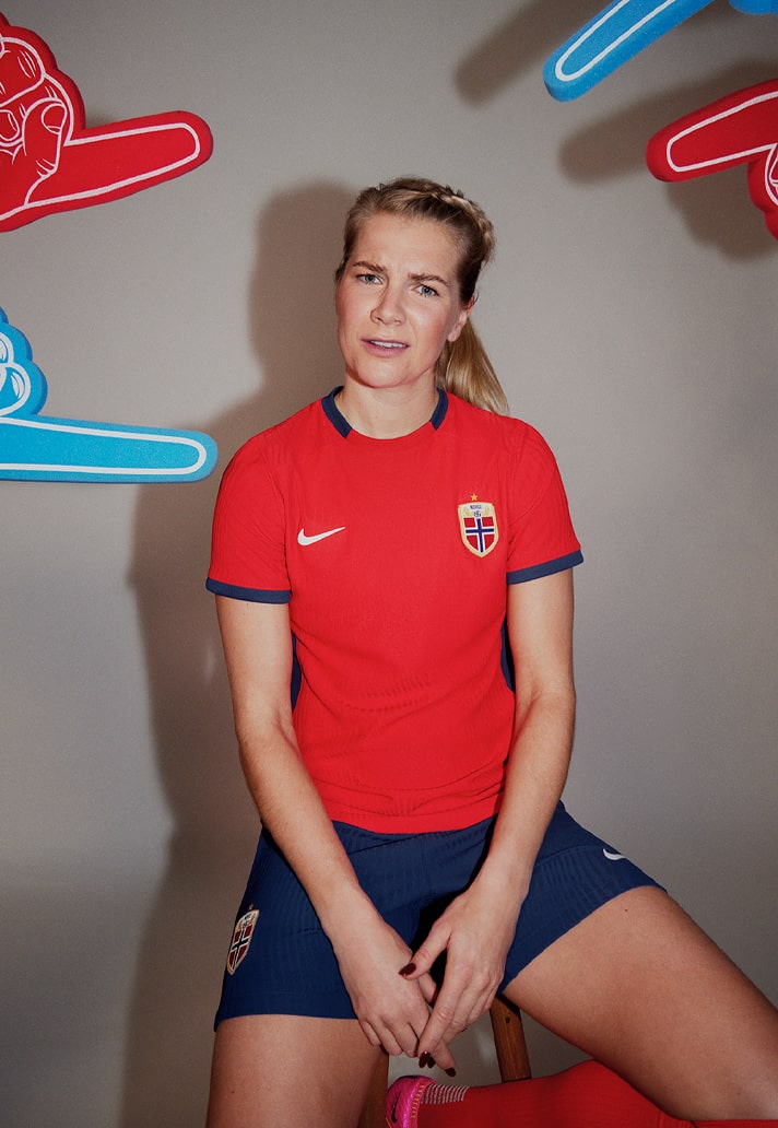 The Norway National Team Collection features bold colour-blocking combinations, allowing the team to mix and match the colours of its national flag in a prominent way. Yeah, code for: not a great seal of effort put into these. Make sure they're in the traditional national team colours, job done. Hegerberg's expression summing it all up.