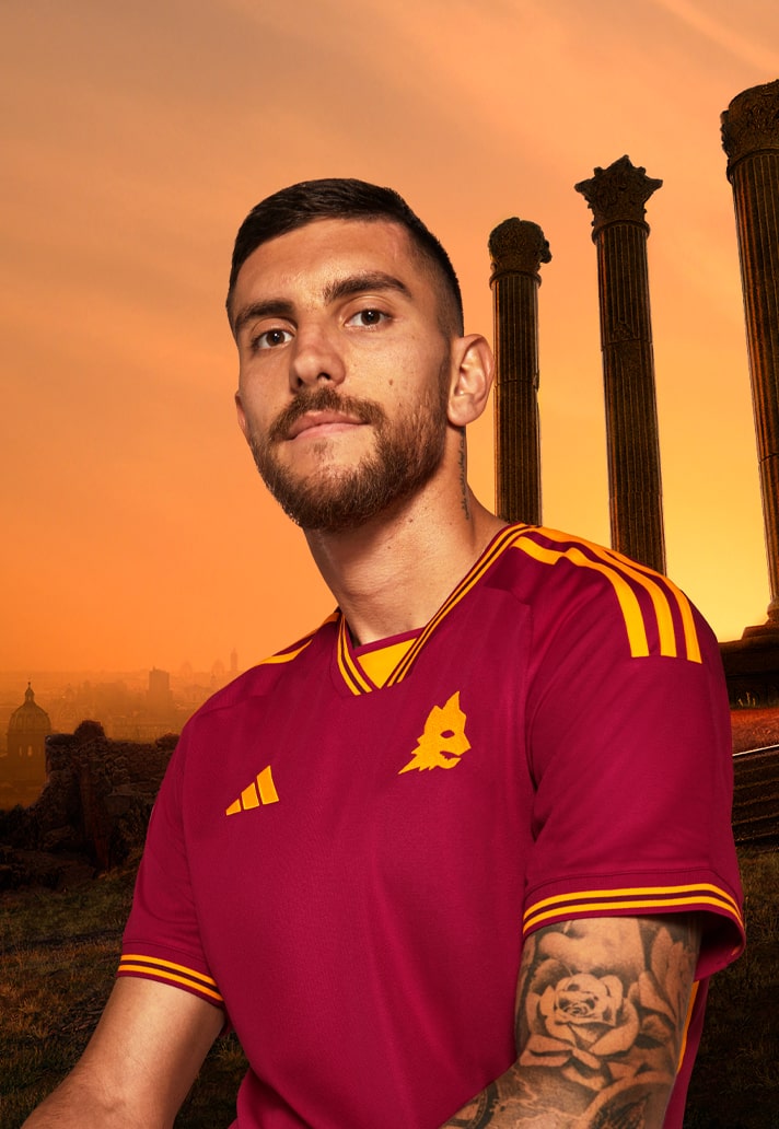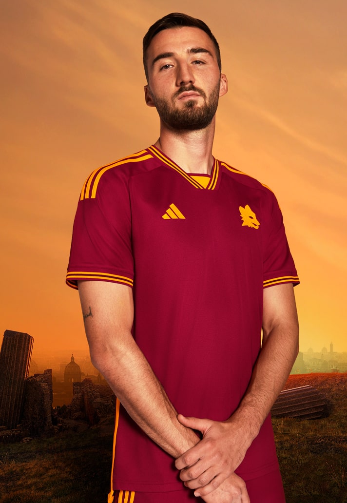 The neckline has a ribbed V-shape with a yellow trim on a red background, while the Three Stripes descend from the shoulders and are echoed on the shorts. The jersey is made with a swallow-tail hem and finished with a detail on the back of the neck that takes inspiration from the Club’s fans, celebrating one of the most iconic expressions of AS Roma supporters: “Daje Roma Daje” (Come on Rome, come on!).