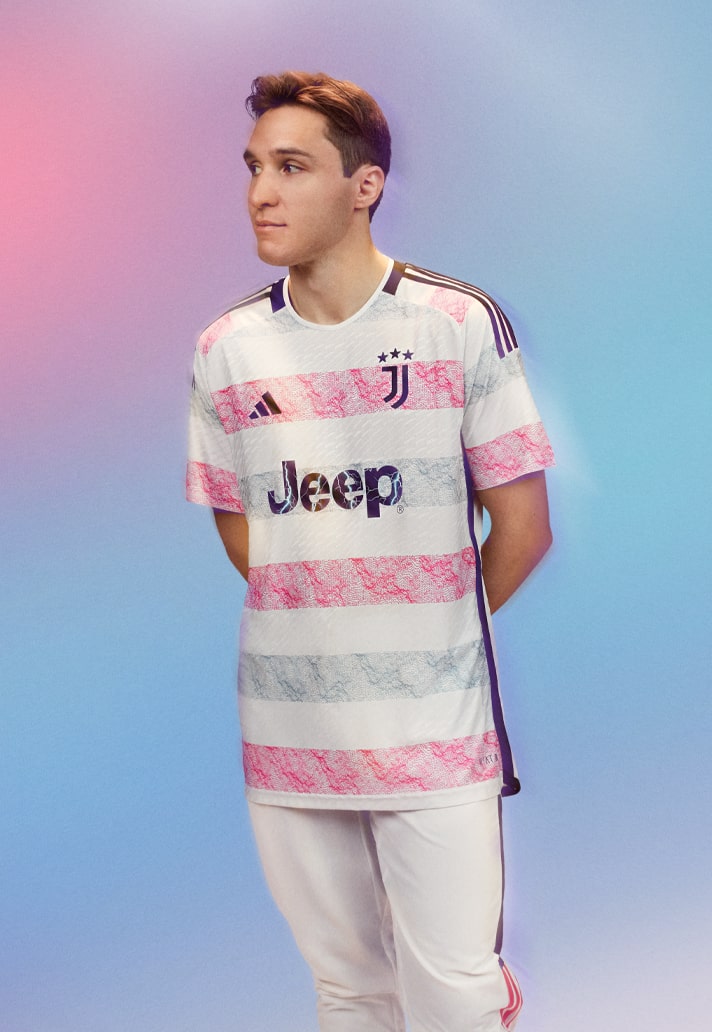 The new Juventus away shirt for the 23/24 season comes on the back of a strong home design that drew inspiration from zebra stripes, which makes sense given the Bianconeri's traditional look. But that theme does not carry across to the away design, which instead draws inspiration from the Turin’s surrounding skyline. Predominantly white, the fresh look boasts an eye-catching aesthetic that reflects the iconic snow-capped glacial peaks of the Italian Alps. Rising above its crisp white base, the grey stripes and iconic Juventus pink show a rugged texture that mirrors the rocky Monte Rosa cliff face.
