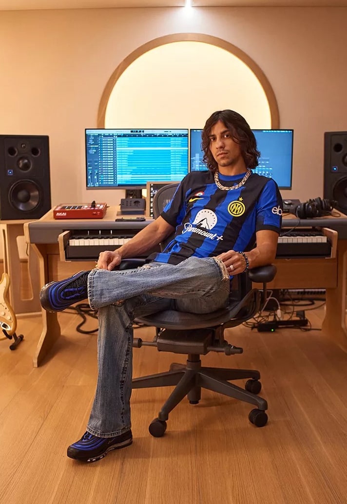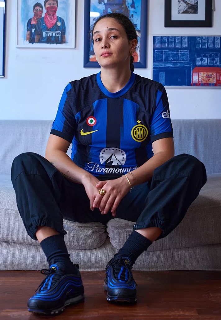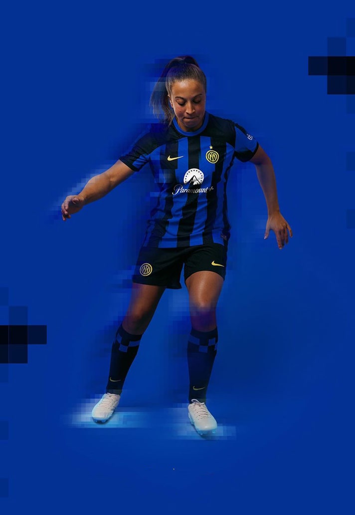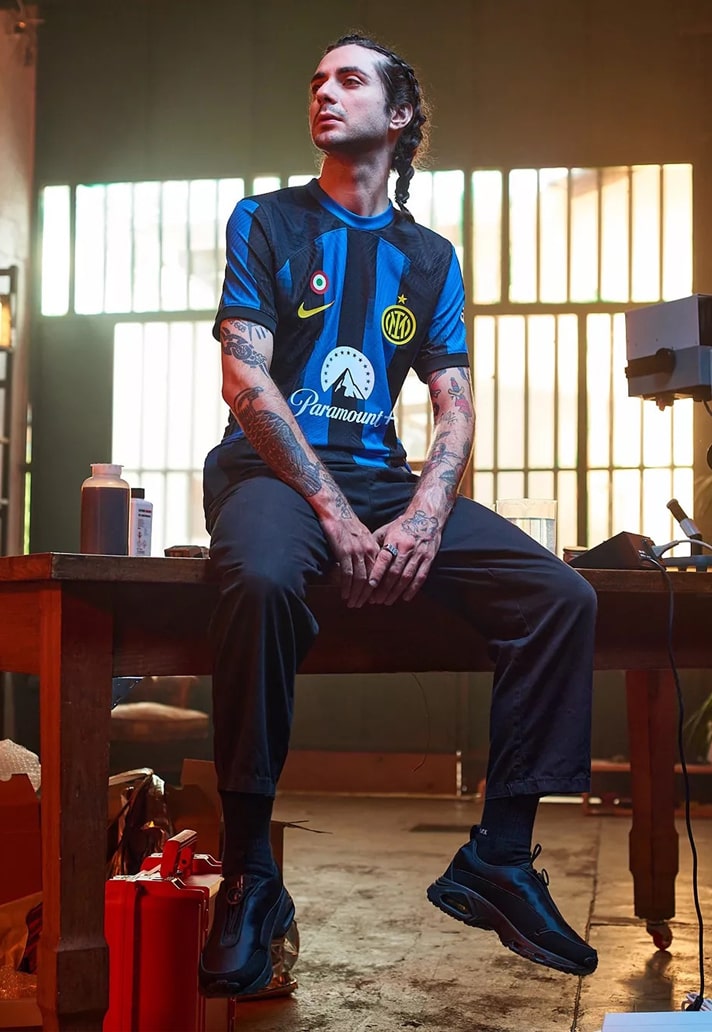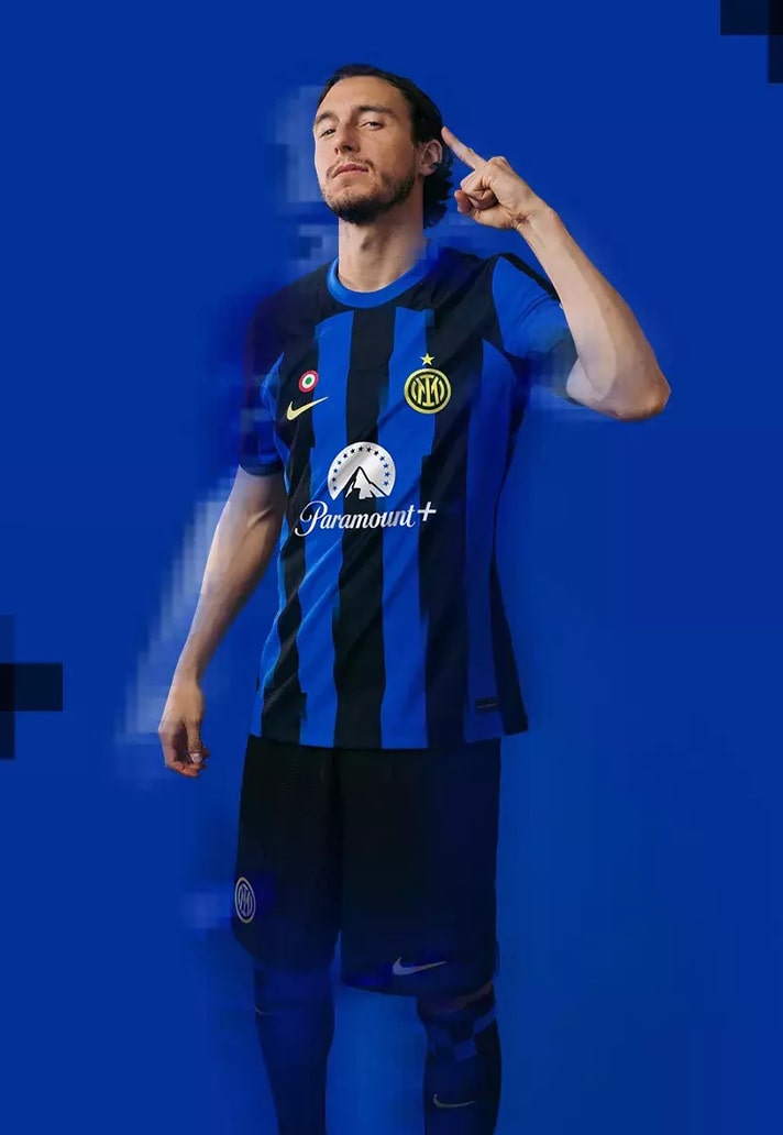 Joining the blurred black and blue stripes are the club crest and branding, which standout in yellow. Meanwhile, following their cameo at the end of last season, notably in the Champions League final, Paramount+ continues as the front of shirt sponsor. Inside the collar of the jersey – made from recycled polyester to reduce CO2 emissions – is a flag of Milan with a black-and-blue mosaic pattern.