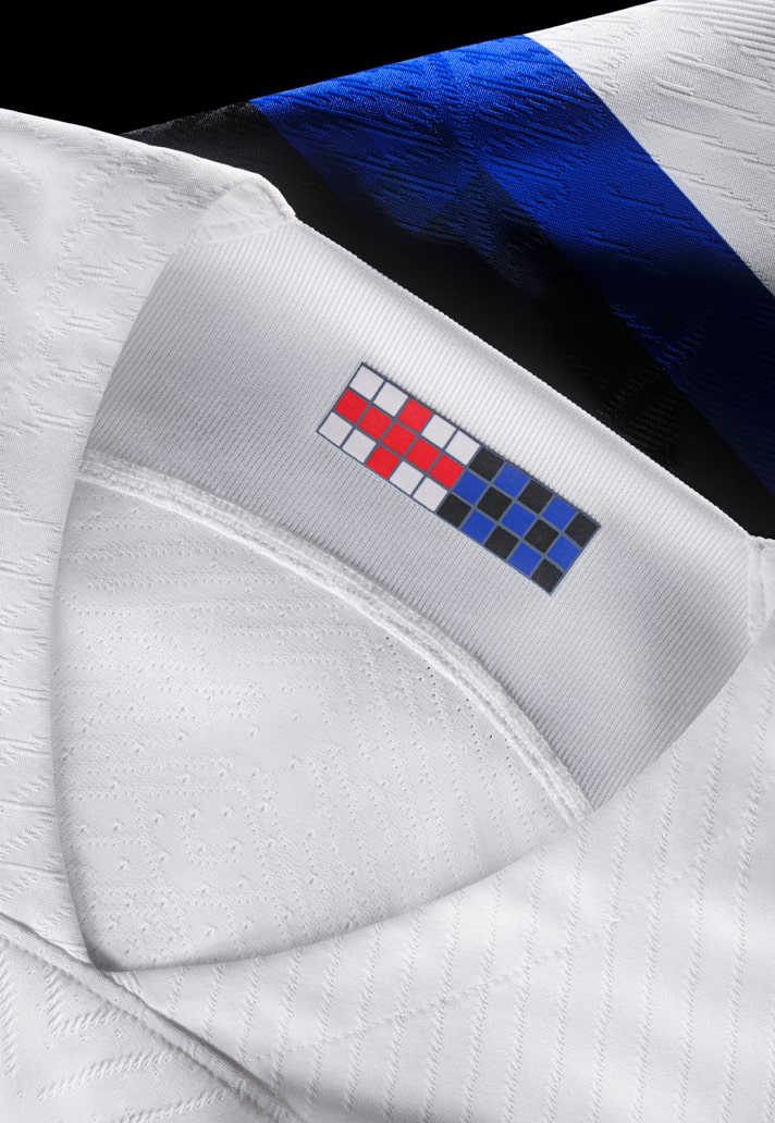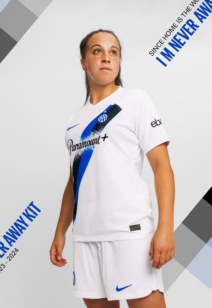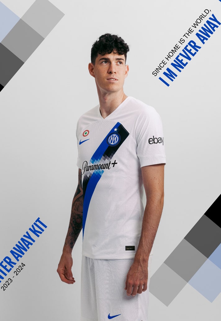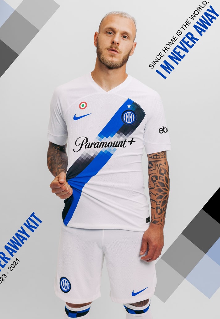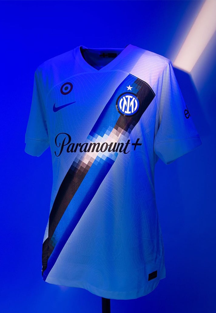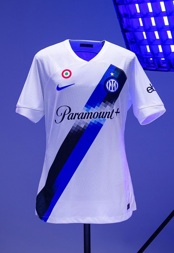 The visual revamp comes not on the white background, but by the crossed diagonal stripe, which sees black and blue merging and switching in the middle. That pixelated break presents the perfect space for the newly announced Paramount+ sponsor to sit. The details inside the back neck maintain an air of familiarity away from home with the flag of Milan and the club colours in mosaic style.