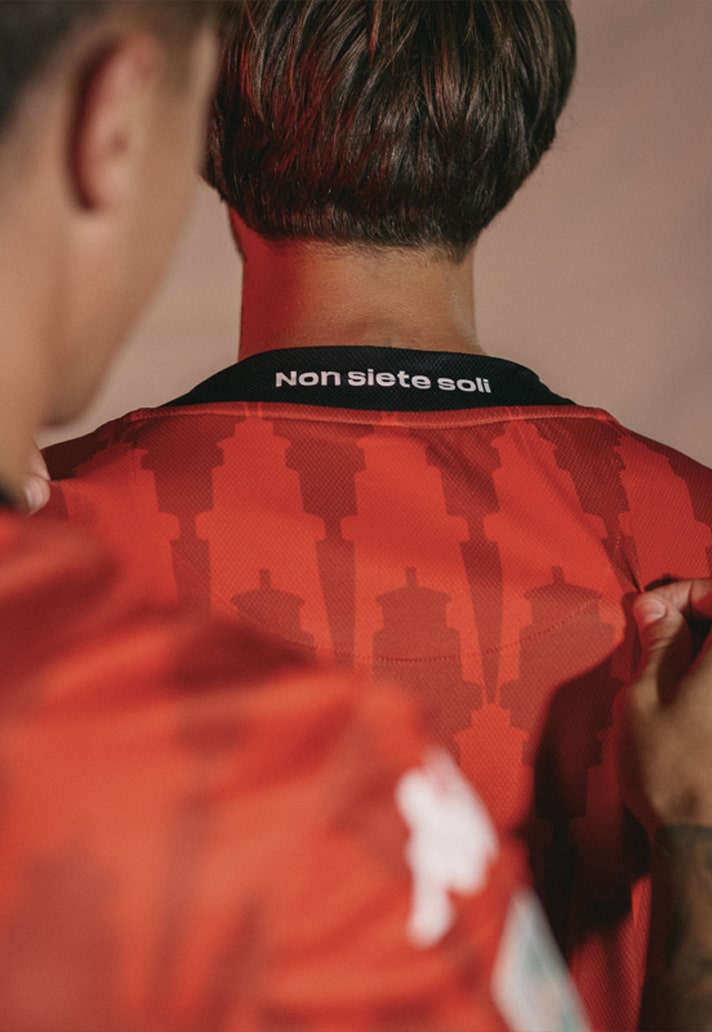 The phrase “Non siete soli” (You are not alone) is applied to the insert on the back of the neck, while Paolo Ponzo's historic phrase is present on the inside of the collar: “Ogni calciatore che veste questa maglia deve sentirsi da una parte onorato, dall’altra fortemente responsabile per ciò che rappresenta” (Every footballer who wears this shirt must feel on the one hand honoured, on the other strongly responsible for what it represents).