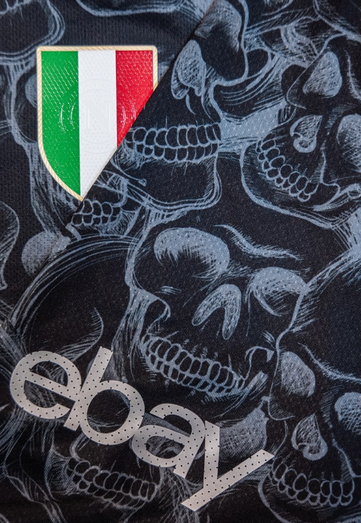 The kit itself features a black base with blue trim, tying in with the name and number set. But the real feature of the shirt is the all-over skull graphic. It’s inspired by the Fontanelle Cemetery in Naples, and ramps up the creepy factor from the 21/22 cobweb design and the 22/23 shirt which was, quite frankly, a bit batty. No, here it’s proper spooksville, particularly when you take a look at the real life inspiration.