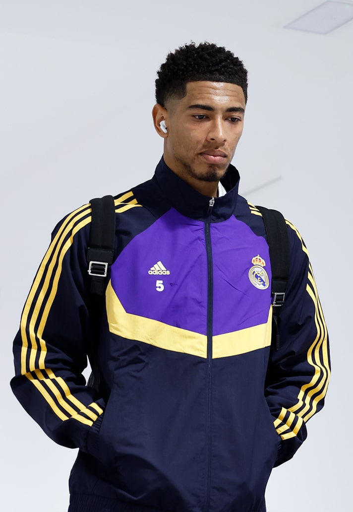 Ahead of their first game of the year, Real Madrid debuted a never-seen-before retro-feel tracksuit as they traveled to the Bernabeu. The jacket is obviously the standout of the complete suit, and it boasts a late 90s to early 2000s style, with a block colour setup featuring a dark navy base with a purple chest and yellow accents framing the look. The same colour configuration is carried across onto the trousers in true tracksuit style.