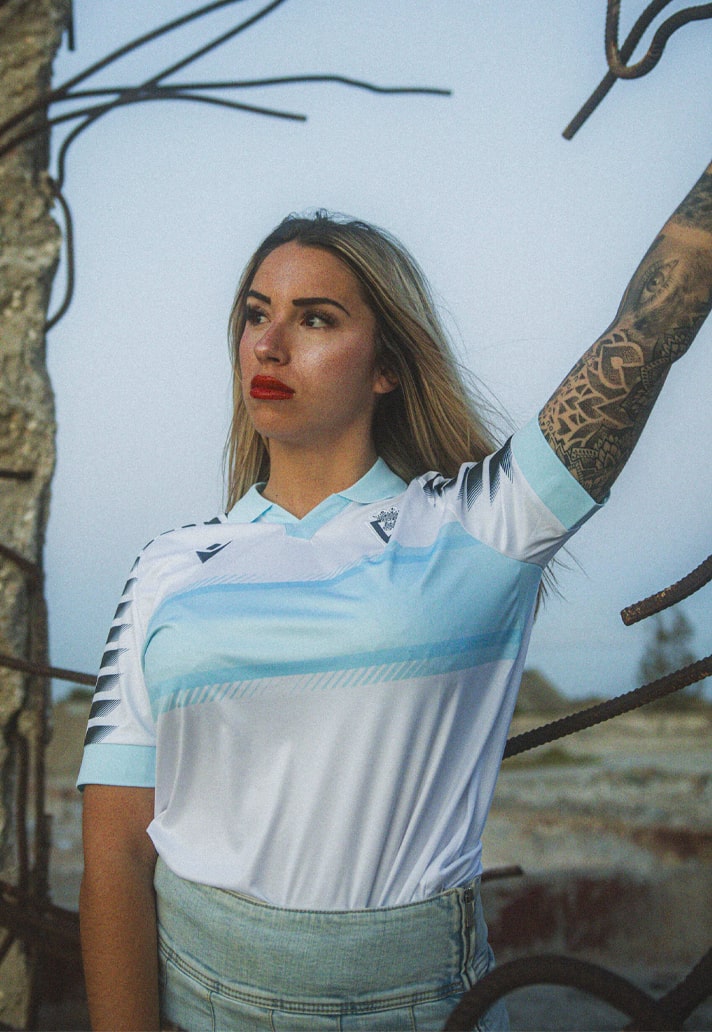 The away jersey rolls things back to the mid-80s, with a white and blue polo collar design inspired by the club’s 1985/86 season away shirt. It’s predominantly white, accented with blue and black. The most eye-catching feature is the blue band across the chest, while a black graphic plays out down the sleeves. A very Lazio-esque feel to this one.