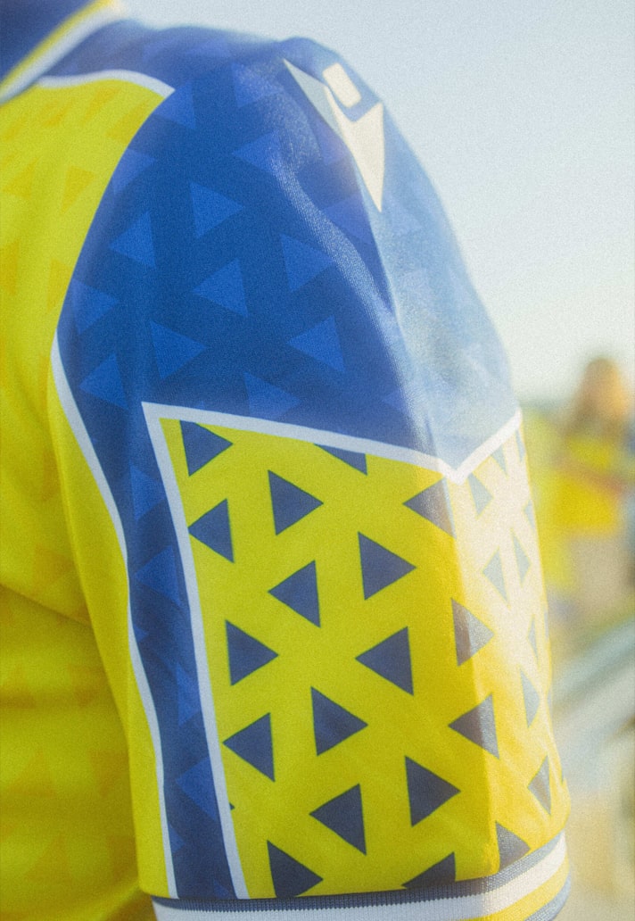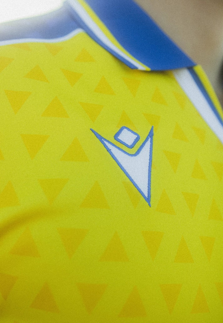 The home jersey design combines the club’s trademark colours of yellow, blue and white, alongside geometric triangle graphics throughout that first appeared on Cádiz jerseys worn during 1991-1994 era. The triangles are sublimated throughout, appearing in differing tones of yellow on the body of the shirt, and blue on the shoulder bands, while they contrast on the sleeves to be a strong feature.