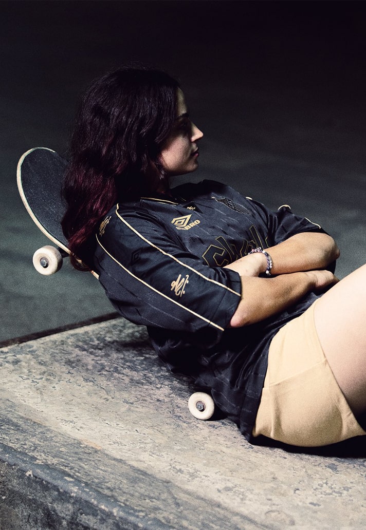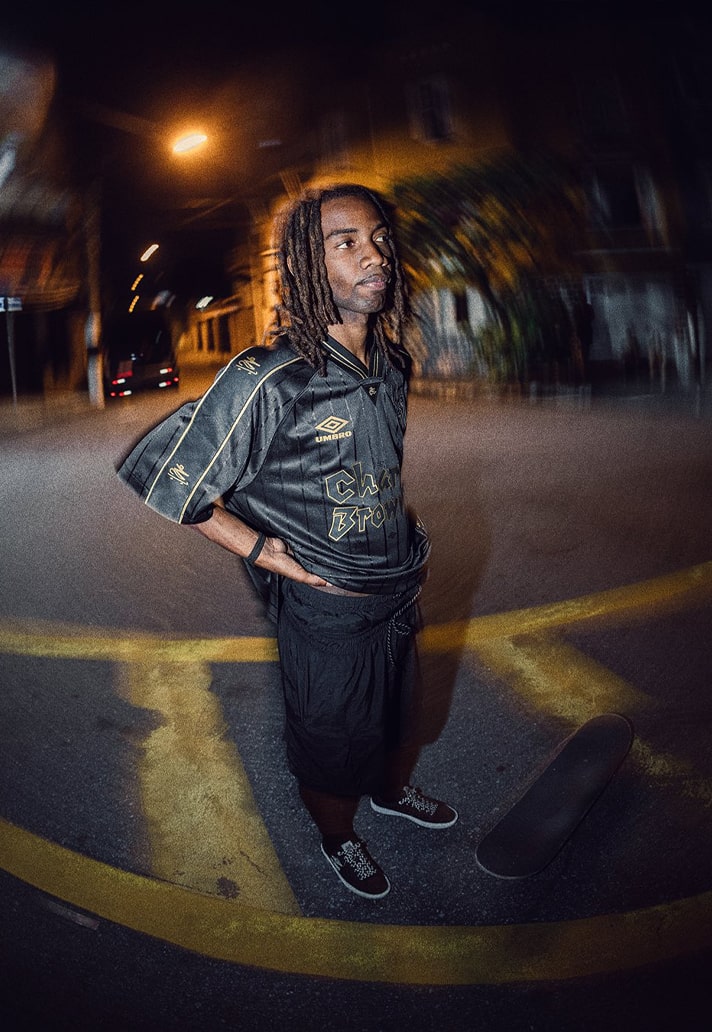 Paying tribute to the band, which originated in the coastal city of Santos, São Paulo, the Santos x Charlie Brown Jr. shirt from Umbro Brazil is limited to 1,992 jerseys to recognise the year that CBJR was formed. Presented in a sleek black pinstripe look, the shirt comes in an oversized fit and features a custom Jacquard fabric with gold branding and taping on the shoulders. The band’s name features across the centre of the jersey in grey with gold borders.