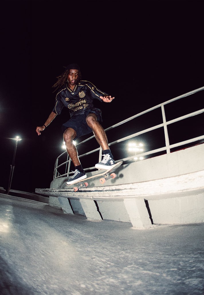 Further design details include the band’s skateboarder graphic incorporated into the Santos crest, as well as sitting beneath the retro v-neck collar and subtly featuring between the pinstripes of the jersey.