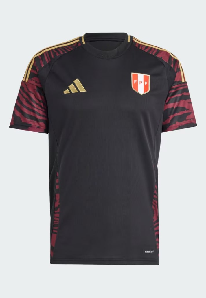 Loving the setup of the Peru away kit, which features a unique textured pattern through the sleeves and side panels. It's inspiration comes from the Peruvian Cajon instrument, and the black base ensures emphasis is on it, while gold accents add a final flourish.