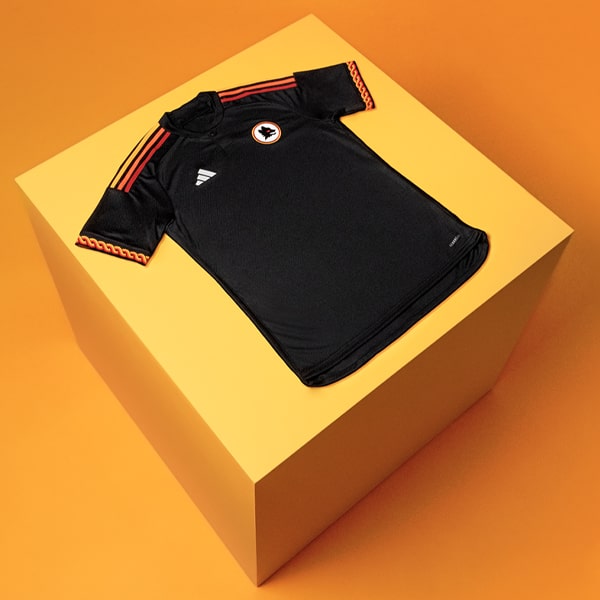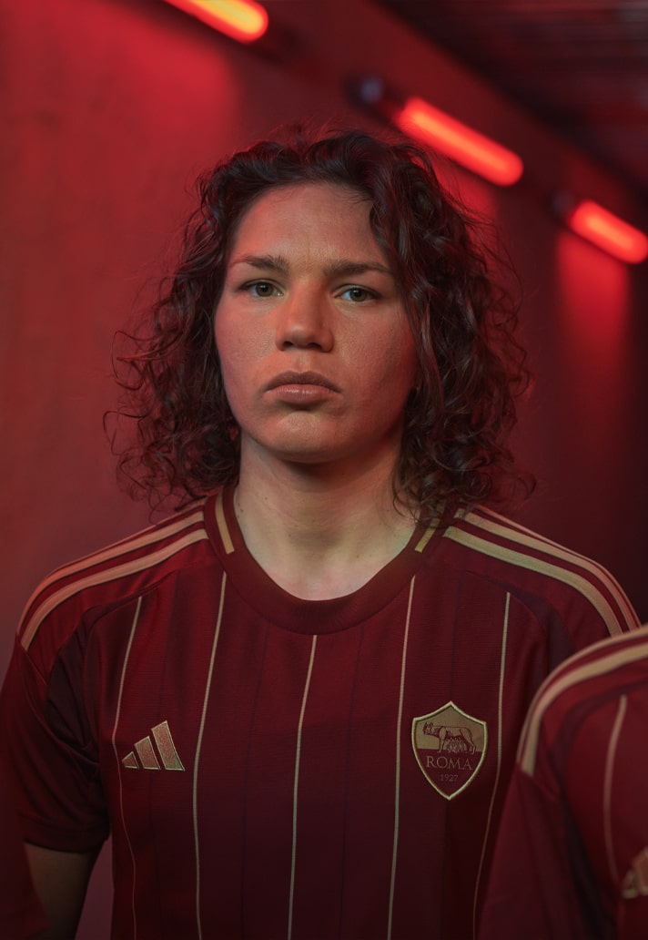 The shirt arrives in a deep red base, overlaid by gold details, notably a pinstripe formation that runs through the front and on the Three Stripe branding. This colour combo is not without thought in itself; it is, in fact, inspired by the season tickets of the 1933/34 season, marked by Roma's biggest win in derby history (5-0), offering a special connection and deeper meaning for Giallorossi fans. To further bolster this connection, on the back of the collar, the detail “A.S. Roma” appears in a font also inspired by the 1933/34 seasonal tickets.