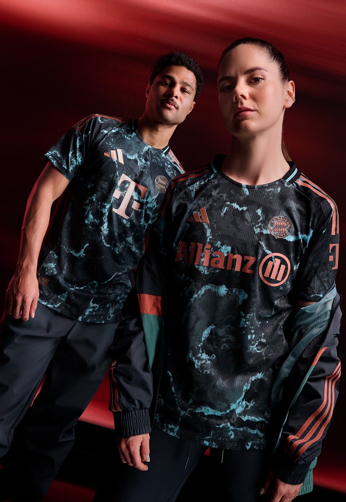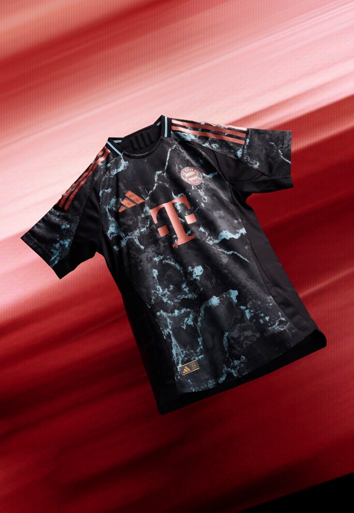 The design is presented in blue and green swirls throughout the black base of the jersey, providing a look reminiscent of the shades seen on the statue’s surface. Joining that all-over graphic, glimmers of ‘Bavaria’ can also be seen within the bronze detailing used across the iconic club crest, the adidas logo, sponsor logo and the Three Stripes that feature on the shoulders of the jersey. Completing the design is the sign off ‘Mia San Mia’ that features in bronze on the rear of the neck collar, in reference to the phrase and song synonymous with the club and its players, and the historic success achieved on the European and domestic stage.