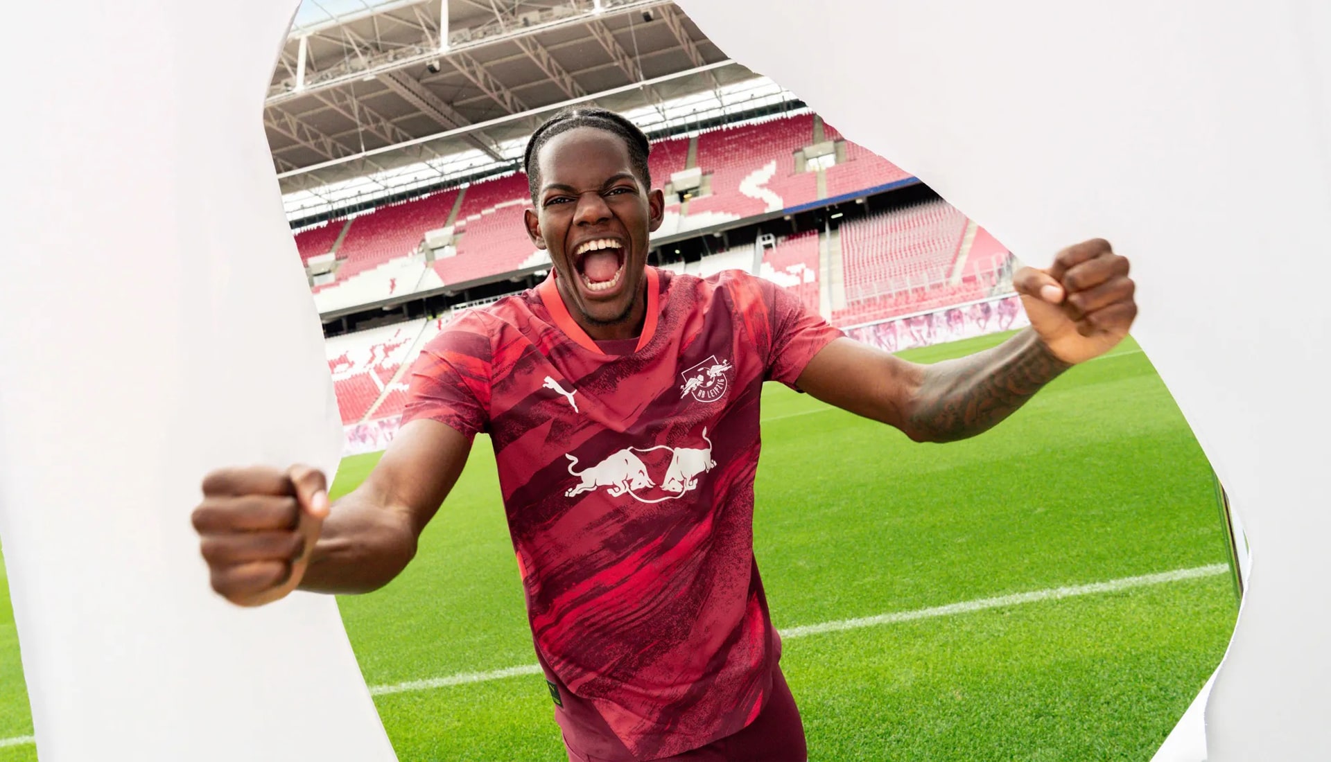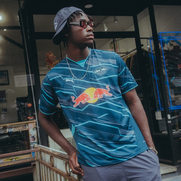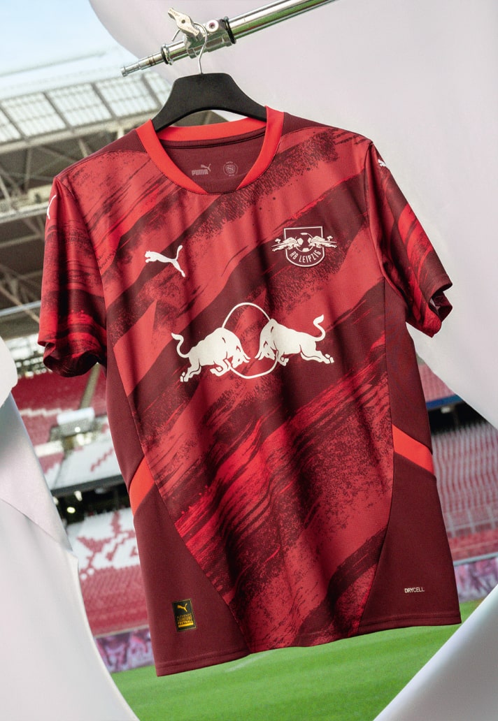 What it actually means is we get an away look that’s drenched in red tones, with the graphic that dominates the body certainly giving the impression of brush strokes. There’s a lighter red tone in the collar, while deeper red tones feature in the side panels, framing the design. The club crest, PUMA branding and Red Bull sponsor then standout in a contrasting white.
