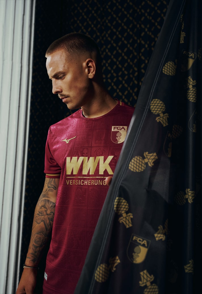 The Bordeaux-coloured jersey features intricate embossing across the front, combining ancient Roman motifs that can still be seen in Augsburg today together with elements of the club’s badge. The logos of FCA, Mizuno and the club’s sponsors are gold, along with gold cuffs on the sleeves and on the collar. The club’s founding year 1907 is featured in Roman numerals on the neck, along with FC Augsburg lettering printed on the back.