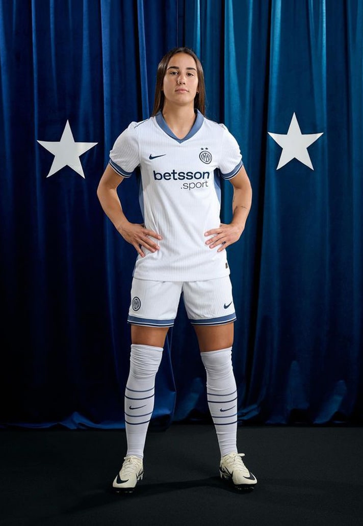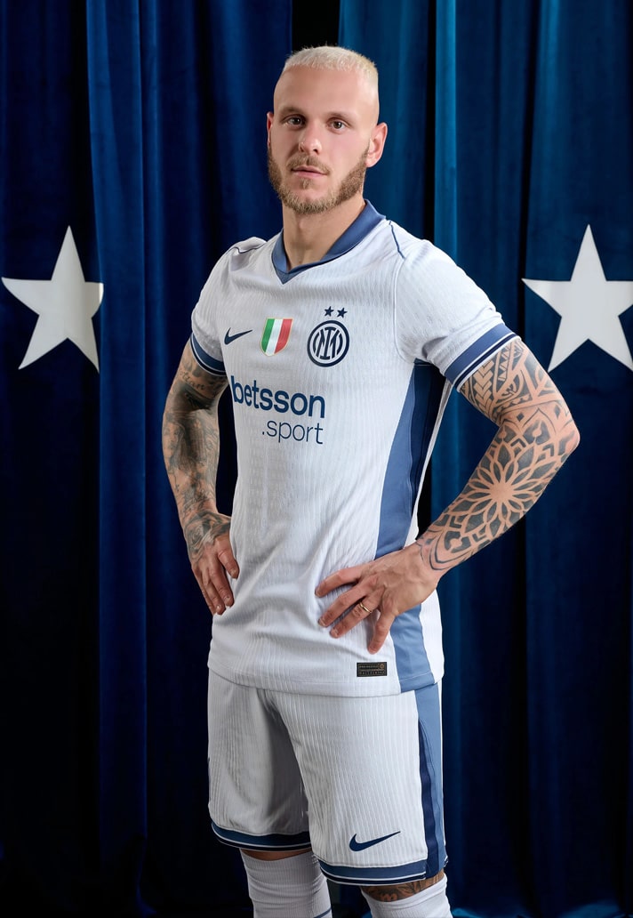 White dominates the shirt as the base colour, sticking with tradition. It’s a colour that’s synonymous with style and elegance, and it’s enriched by grey tones – a colour that is historically part of Inter’s DNA – on the shoulders, chest, and sleeves. The tricolour returns to the centre of the shirt, as it also does on the home shirt, with the monogram badge and two stars placed on the heart, altogether recognising Inter’s title win last season and acknowledging their status as defending champions. Again like in the home shirt, a special detail can be found inside the collar: the Nerazzurri Biscione snake and the coat of arms of Milano