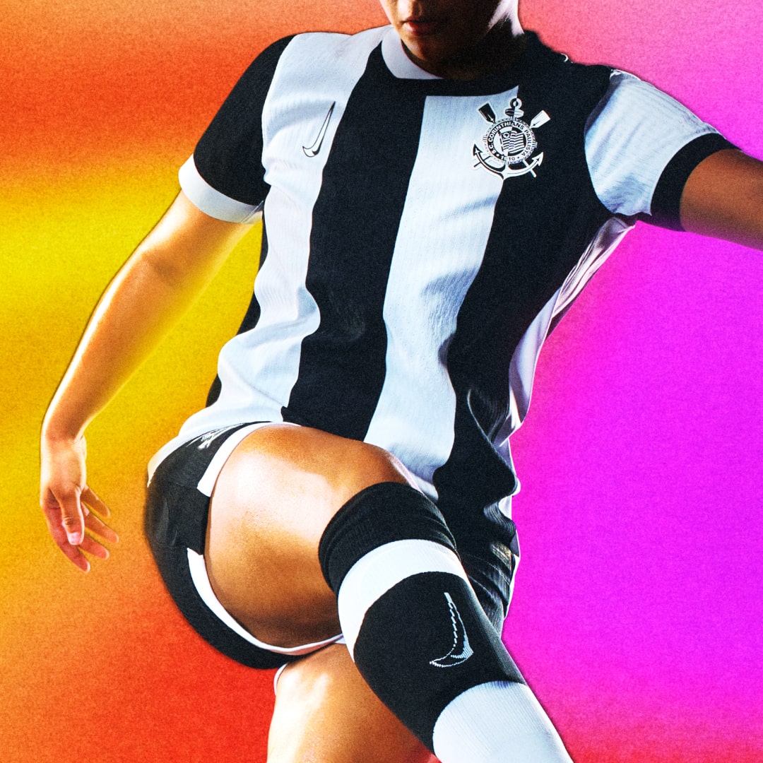 Featuring iconic black and white vertical stripes, Nike’s Corinthians third kit represents the club’s fanbase uniting to fight racism. Honouring the club’s history, the players’ names and numbers are displayed in a silver font created by designer and art director Giulia Fagundes. The lettering is inspired by the rich culture of the African diaspora, featuring a texture of Adinkra symbols of Ghanaian origin. Inside the shirt, the words "Tamo Junto e Misturado" are printed in black and white to represent the importance of standing together.