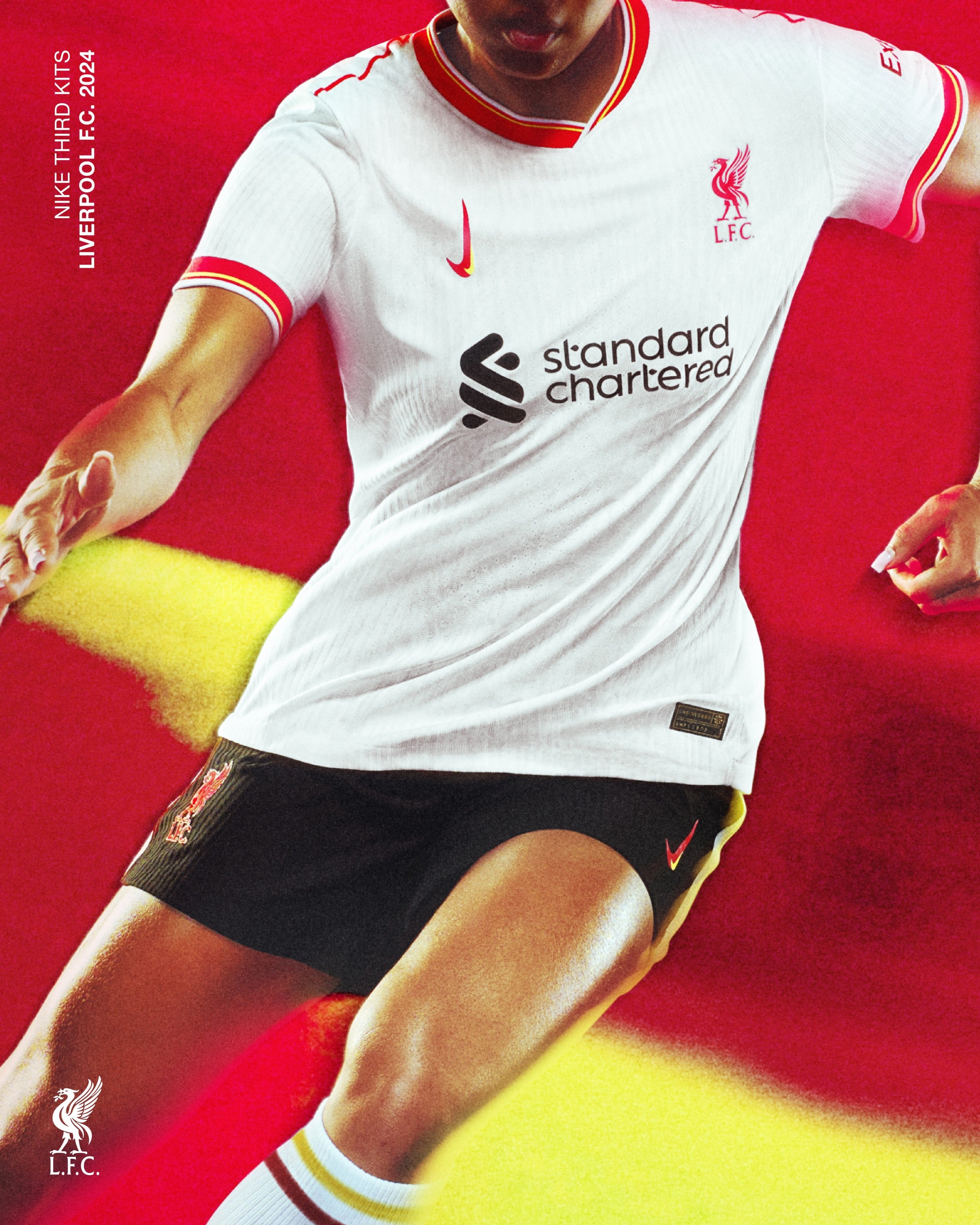 In a nod to the female punk artists who pioneered a new sound where the River Mersey meets the Irish Sea, Nike’s Liverpool third kit fuses iconic club colours with a loud pattern that pays homage to the city’s fearless artists. The white kit has enhanced comfort and fit with pure platinum details and flashes of the club's iconic colours global red and chrome yellow finish the shirt. The jersey is matched with black shorts and white socks.