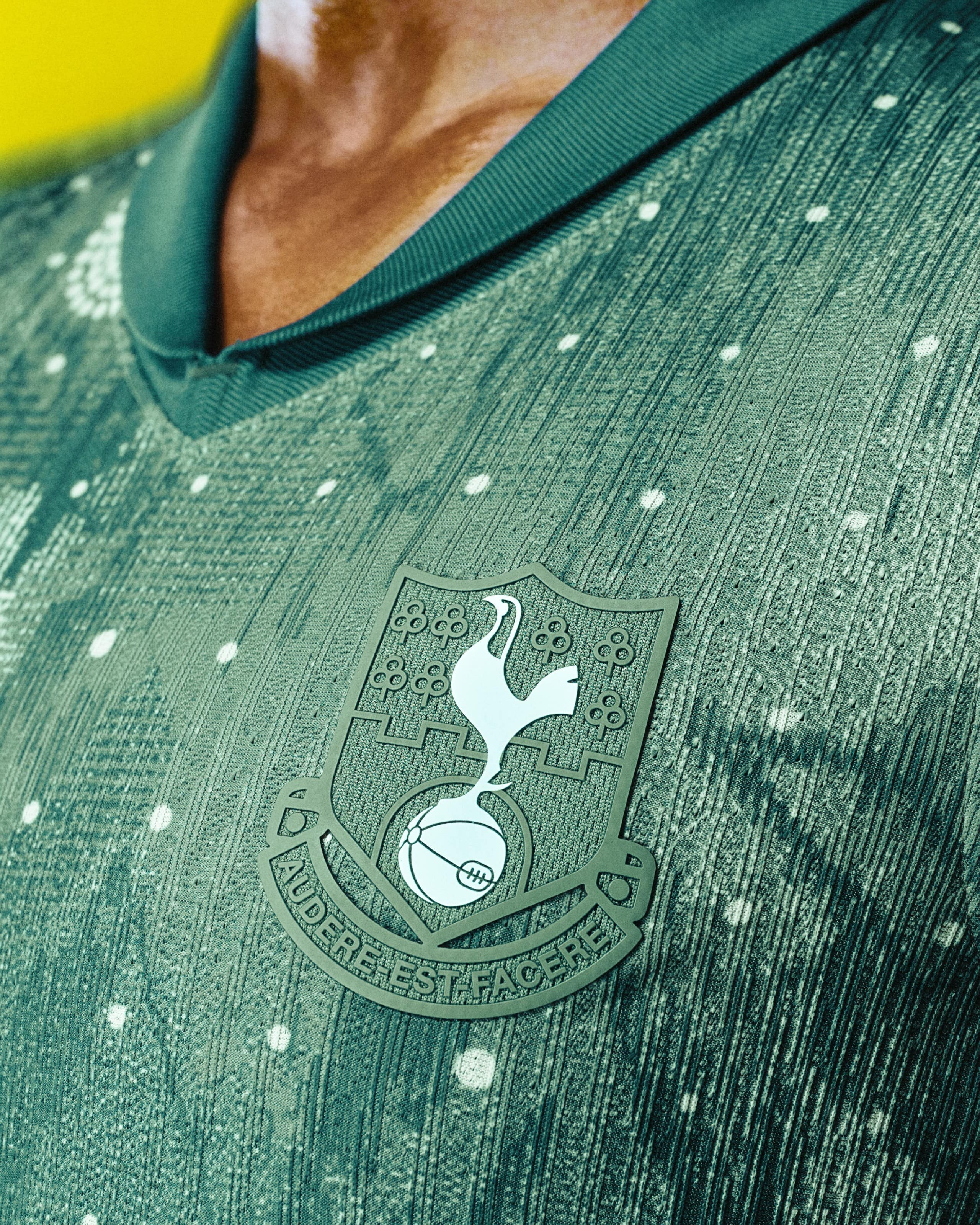 Nike’s all-green Tottenham Hotspur third kit features a rebellious DIY aesthetic inspired by the club’s London N17 heritage, with subtle references to the trees the area was named after. The ‘Seven Sisters’ are a ring of seven trees that have stood in South Tottenham for hundreds of years, captivating local residents for generations. Legend has it that the original elms were planted in the 1300s by seven sisters from a local family. The kit also features a shielded retro crest that blends the current Spurs logo with the crest used by the club between 1997 and 1999.