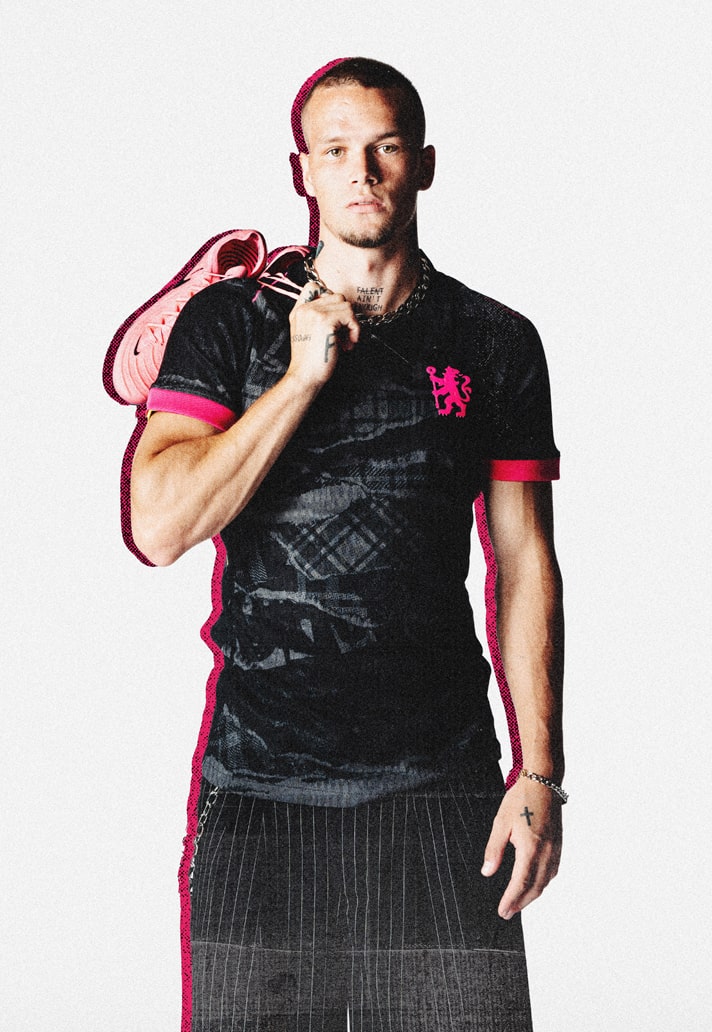 Standing out in a black jersey and shorts trimmed in dayglo yellow and pink, harking back to shockwaves a radical clothing boutique at the club’s end of Chelsea generated in the 1970s, ripped-up clashing punk patterns are revived in the weave. If the Blues’ patch typography is straight out of 1977, the vertical double Nike Swoosh – present on the brand’s key European team third shirts this season – nods to the current acceleration of the women’s game. And then, joining that double Swoosh is the lion that replaces the full club badge, presented in a double layer too – giving it a 3D feel.