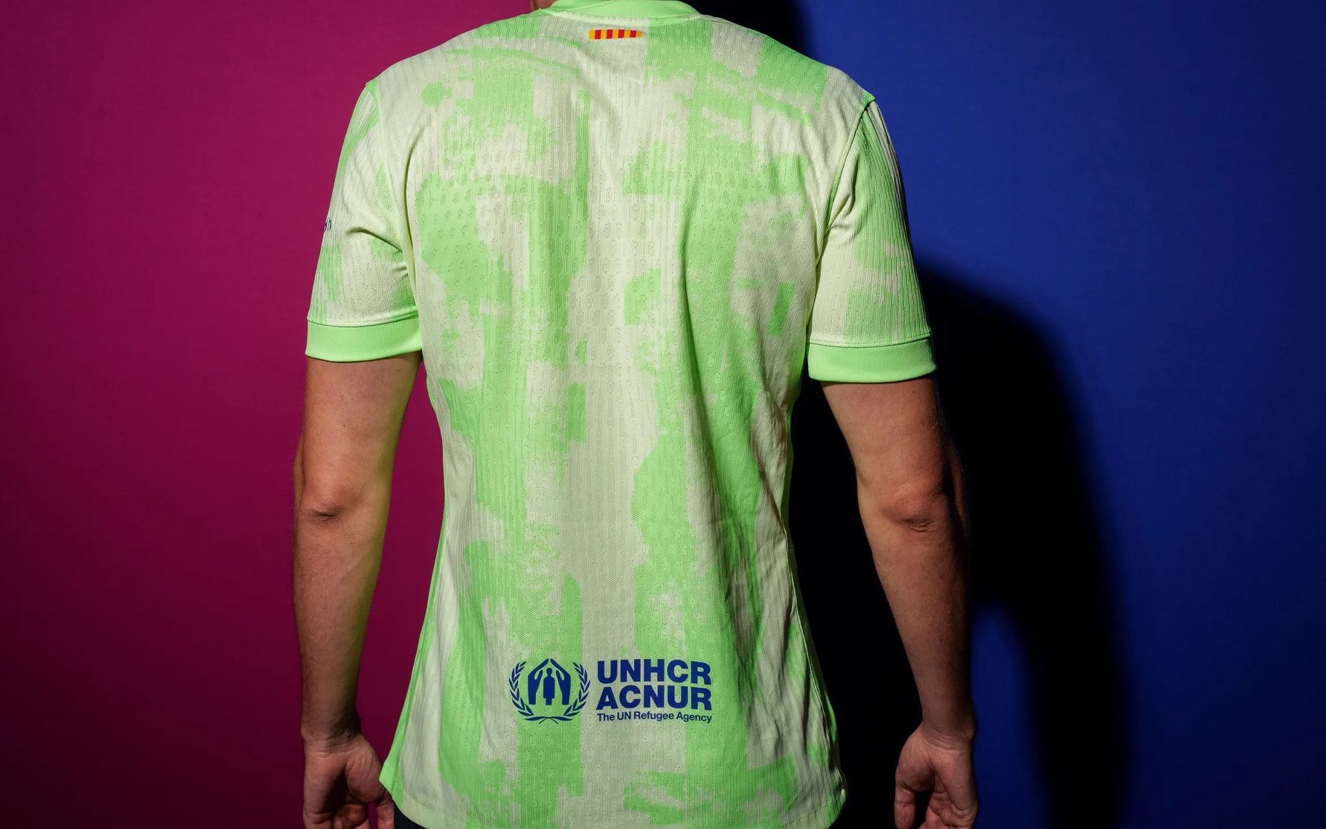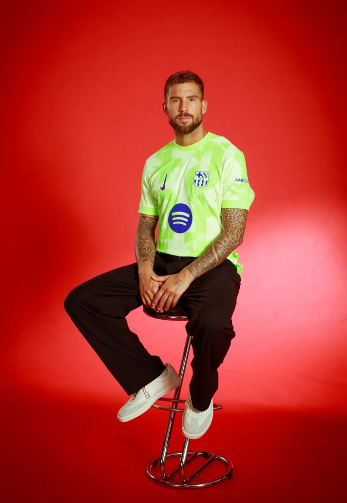 The shirt design itself sees that tonal green graphic play out across the whole design, with the Spotify sponsor logo and club crest sitting in position in blue. The design is then finished with that previously mentioned vertical blaugrana Swoosh.