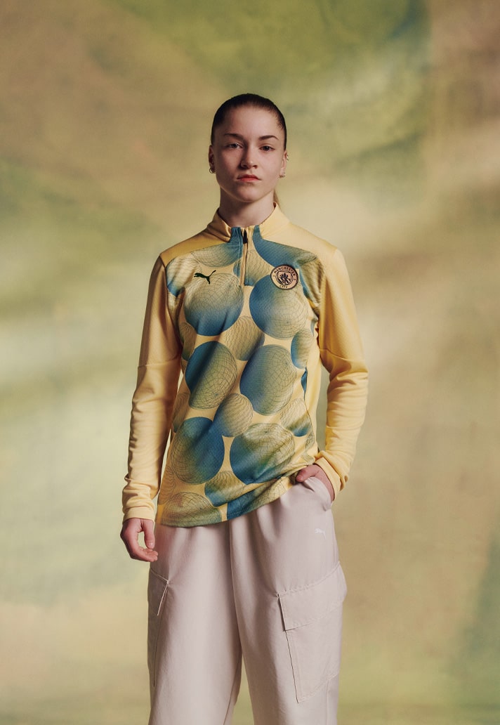 The Jersey features a light straw base colour with bold blue side panels and sleeves with subtle poppy pink detailing on the cuffs and panels of the jersey. Intricate outlines of marine blue supersonic waves adorn the jersey, with PUMA paying tribute to the colour palette from the iconic album cover creating a jersey that is Definitely City. The kit is part of the Definitely City collection, which includes a Track Jacket and Pants, Overshirt, Bomber Jacket, Tee, Polo, Retro Jersey and Drill Top.
