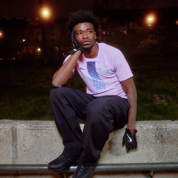 Seductively sleek design once again uses a Nike jersey and sees a black base joined by a regal golden graphic that plays out in a diagonal formation across the lower left half of the jersey. The word “Dream” appears on the back hem of the shirt in a custom script typeface and a checker block design made of up the official colors marks the yoke for this away strip.
