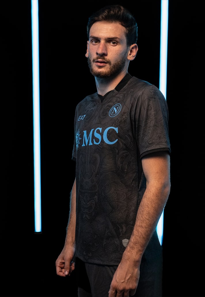 The jersey was designed as a modern armour for those that wear it. It pays homage to the figure of the Samurai and features distinctive details such as the kabuto (helmet), the menpo (mask), and the katana, a symbol of strength and protection but also of ideal union between cultures. The samurai mask sits on a pattern of waves, a motif that makes reference to Japanese art. The shirt also features a design enriched by the Neapolitan baroque style, as seen on the finish around the collar, which adds a touch of elegance and pays homage to the artistic traditions of Naples. On the right side of the shirt the seven Bushido virtues are written: Righteousness, Respect, Courage, Honour, Compassion, Honesty and Loyalty. These are the fundamental principles of Samurai discipline.