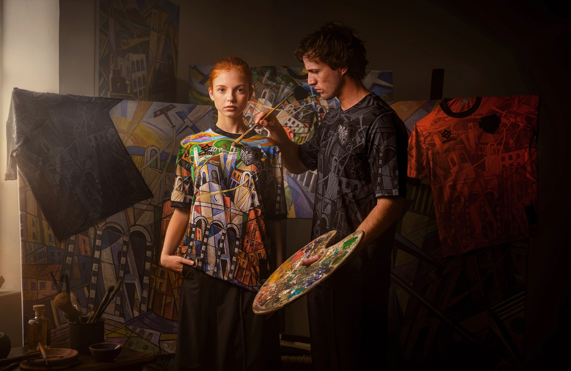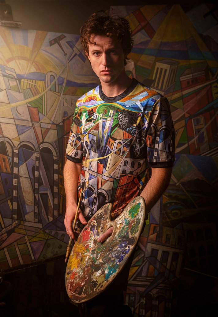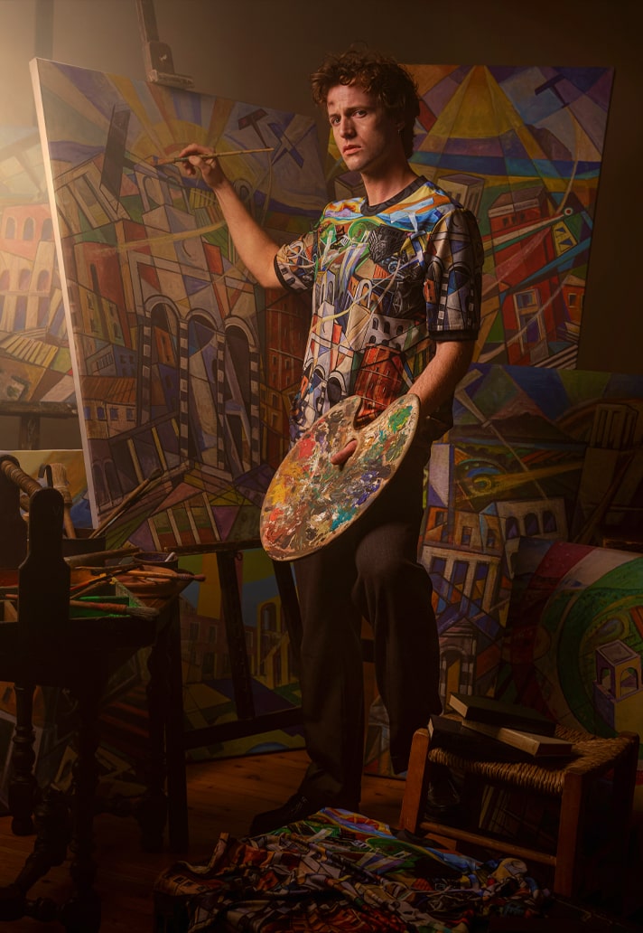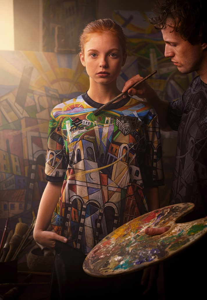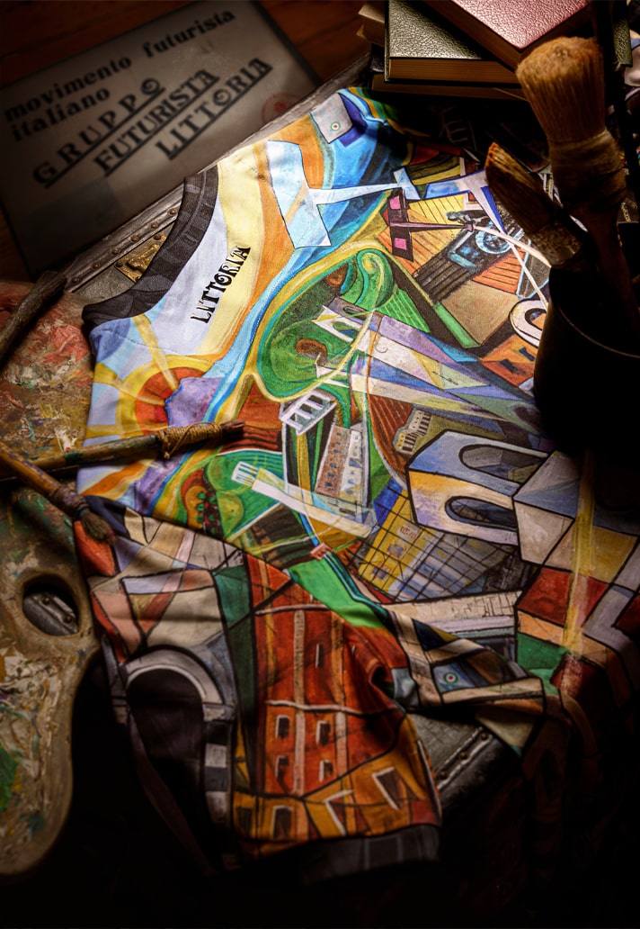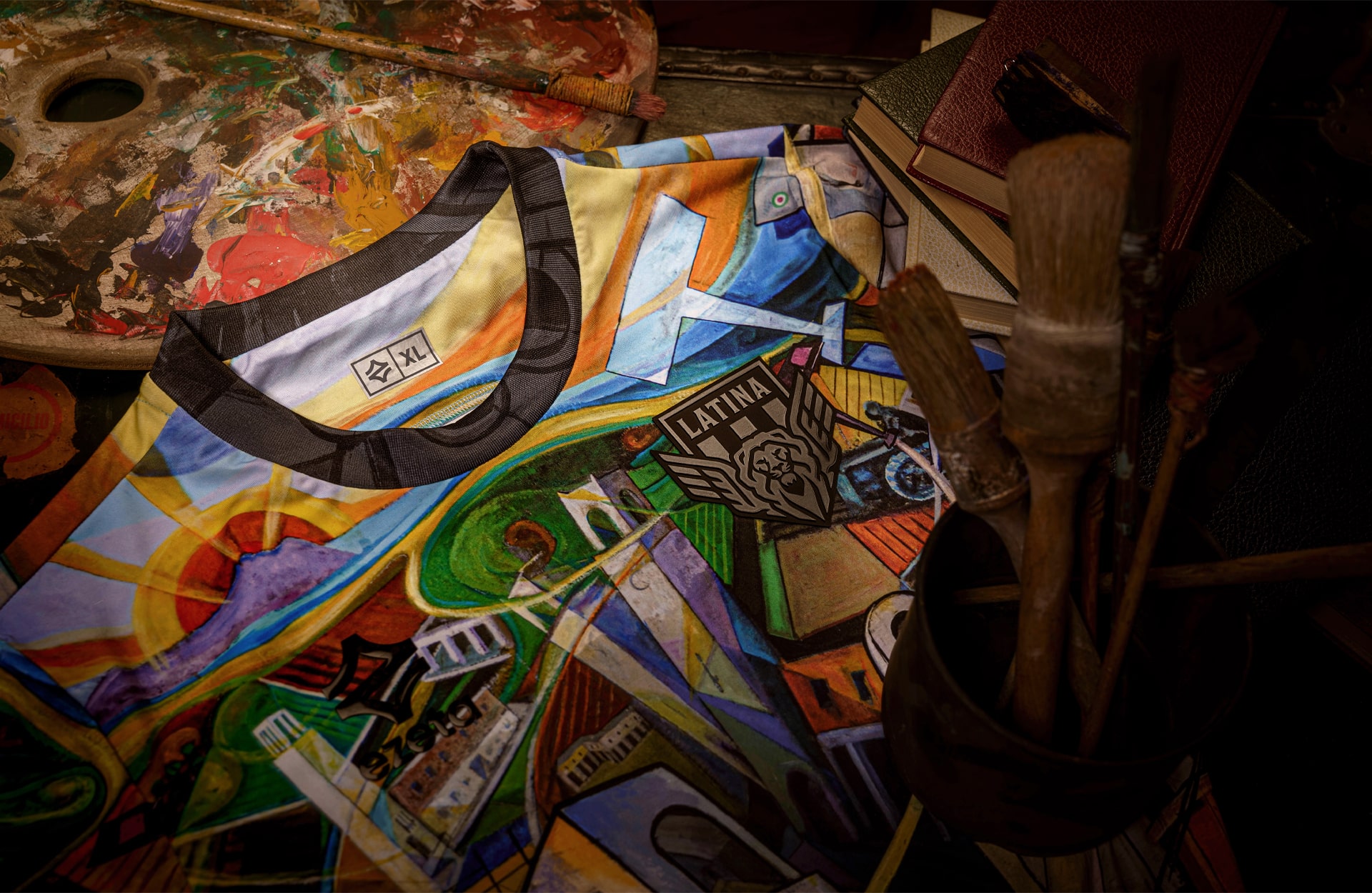 The collection is made up of three jerseys: the first is a multicoloured presentation that lifts Sibò’s work right off the canvas, recreating it as a special edition match jersey that Latina are set to wear on 16 December in their match against Audace Cerignola. That vibrant look is then joined by an orange version and a blackout version, both carrying the same graphic design in the fabric, but washed of all other colours.