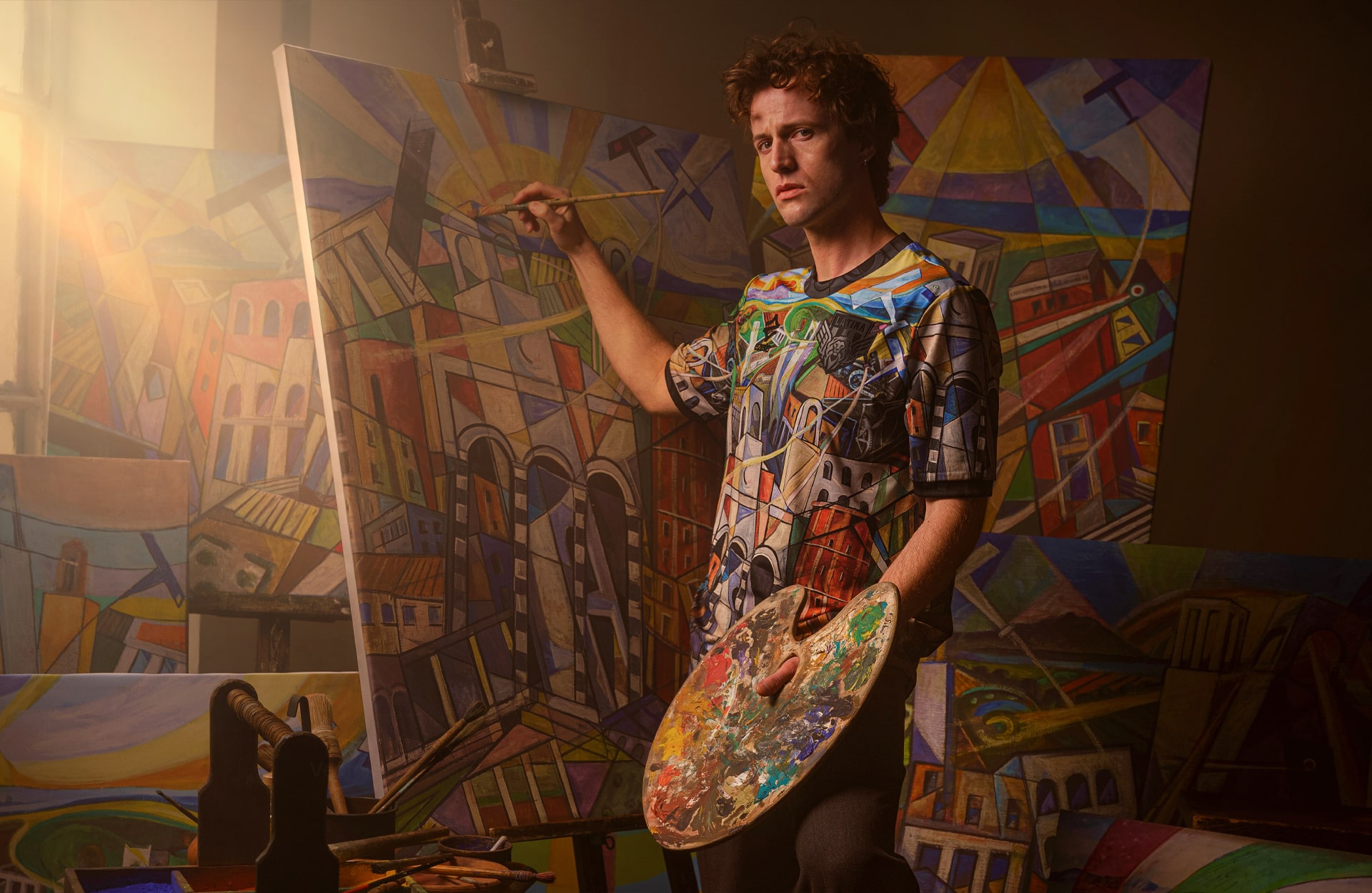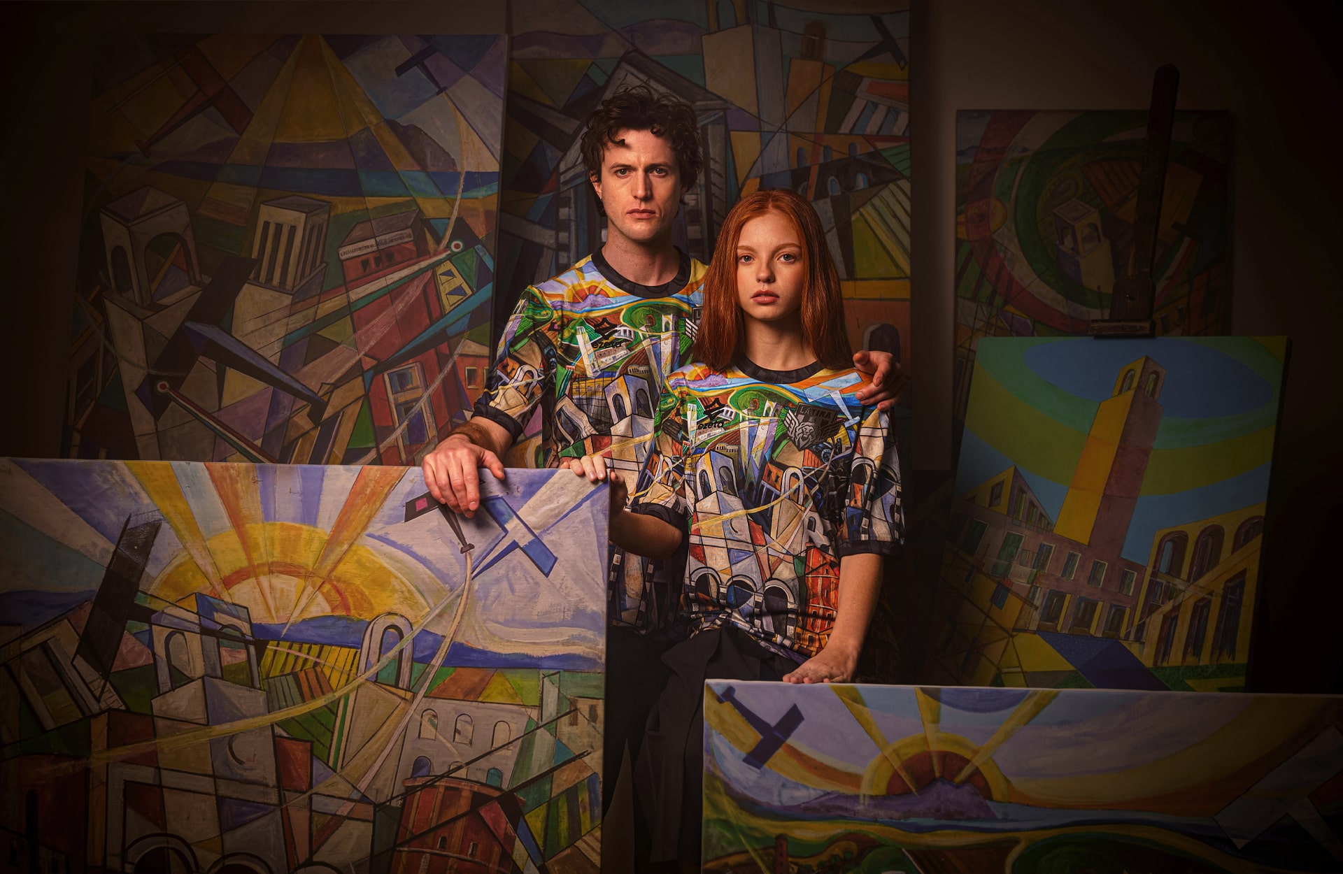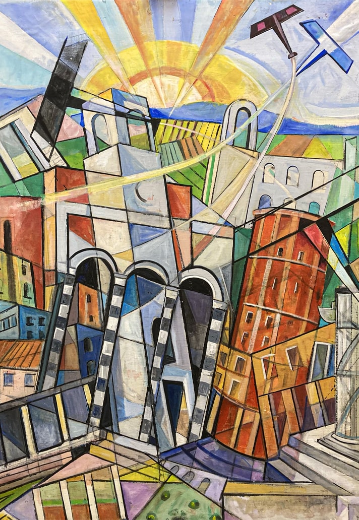 Sibò’s distinctive style turns rationalist architecture into dynamic explosions of geometric shapes and vivid colours, offering a fresh, vibrant interpretation of the city’s landscape. His paintings, which celebrate mankind’s triumph over nature, also commemorate the monumental land reclamation of the Pontine Plain, a key chapter in the region’s history.