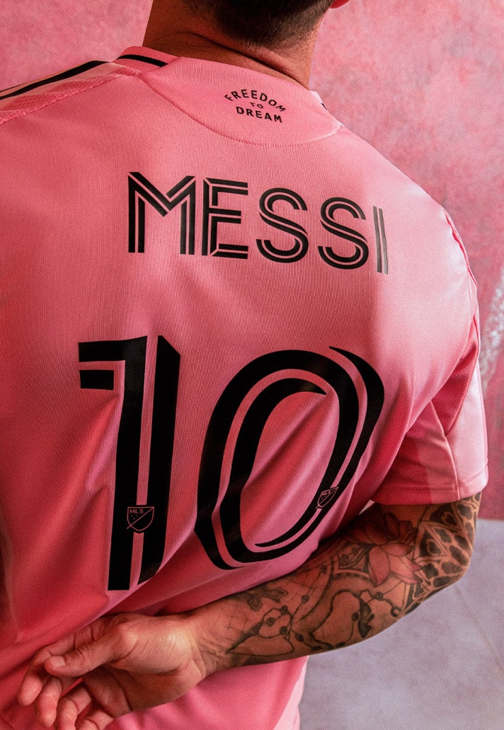 Unsurprisingly, the Euforia kit features a bold all-pink base paired with sleek black accents – loyal to the traditional colours of the club. The classic Miami ‘M’ is embroidered into the bottom corner of the shirt, along with the words ‘Freedom to Dream’ that are featured on the back of the neckline. Perhaps a nod to previous kits Messi has worn, this newest home shirt features different shades of pink fashioned in vertical stripes down the shirt – similar to both Argentina and Barcelona traditional stripes.
