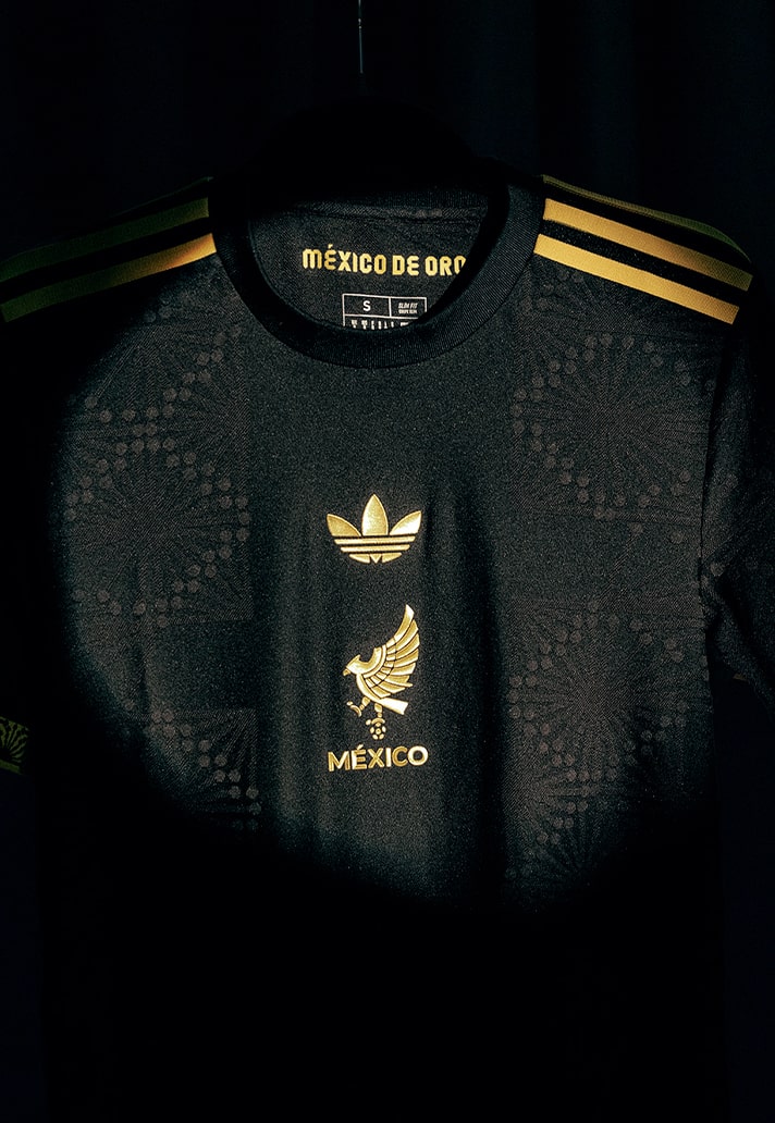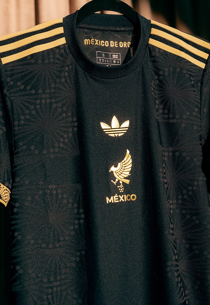 The Mexico national team players now become the stars of their own film, with all eyes on what Mexico can succeed in the next couple of years for the fans that live and breathe fútbol. Adidas have dressed the players in a kit that is appropriate for stars, fashioning a clean black and gold colourway. The all-black base sees glowing gold accents amongst a deconstructed Mexico crest, which is paired next to the iconic Trefoil logo. The Trefoil has not been seen on Mexico jersey for over 30 years but now makes a triumphant return in one of the cleanest national team kits we have seen in years. Give us some serious 80’s nostalgia. Detailing on the collar and cuffs take on inspiration from the Mexican tradition of the Mariachi, staying true to the traditional culture of the country.