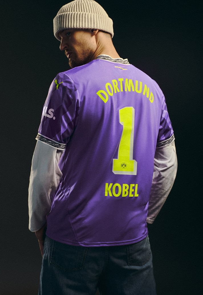 The jersey itself arrives in a neon yellow base, taking over most of the shirt. Black patterns create a disruptive design across the sleeves, on both short and long version. A v-neck collar fashions a zebra-like pattern, which also features on the sleeve cuffs. Black again adorns the Puma logo and BVB crest, sticking to the neon yellow and black colourway. The goalkeeper kit takes on a different colourway, modelling a smooth purple with the same detailing on the collar and sleeve cuffs.