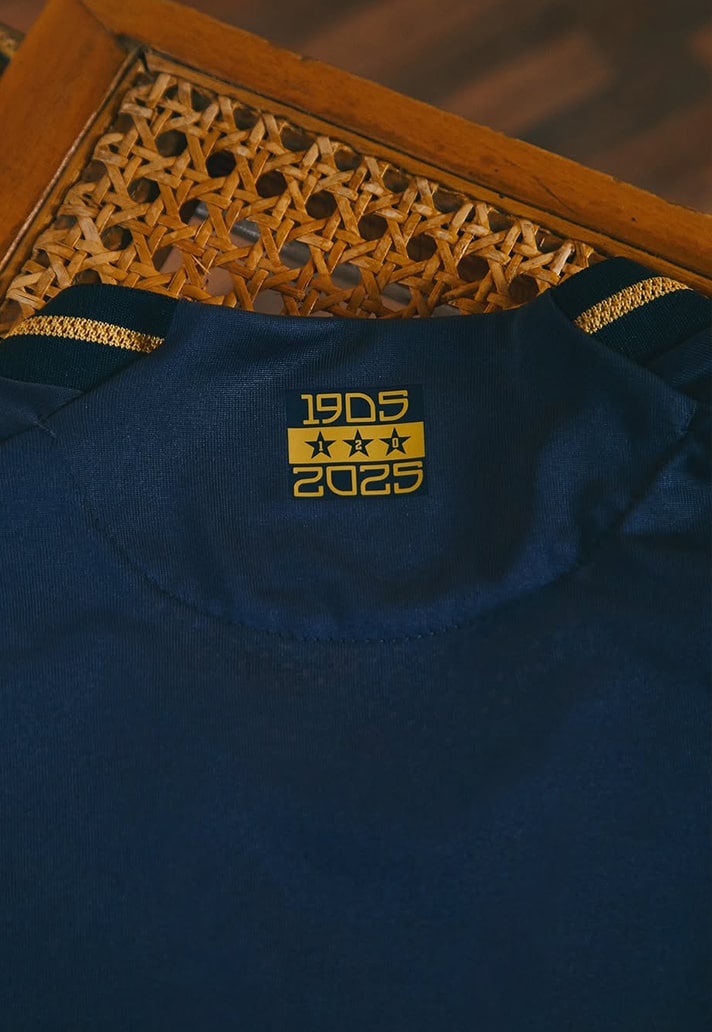 Today, Boca Juniors have officially unveiled their 2025 third kit which celebrates this year being the 120-year anniversary since the club was founded. Combining a dark navy with luxurious touches of gold, the shirt pays homage to the recent championship win as well as the club’s rich history of success throughout since their founding.