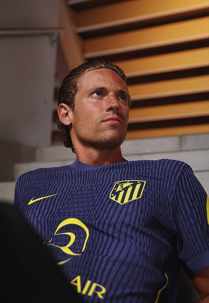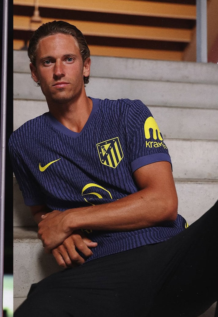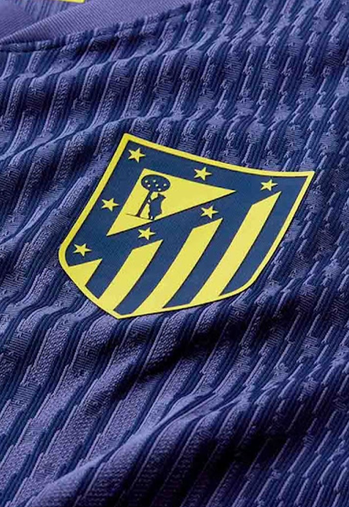 Atlético Madrid bring the energy to the 2025/26 season with a striking new away kit. Designed by Nike, the jersey brings to life a deep navy body with flashes of vibrant yellow accents – sure to stand out on and off the pitch.