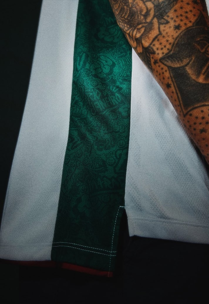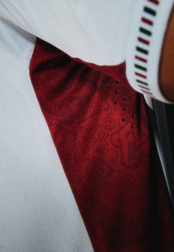 While the front keeps it crisp, the sides of the jersey tell a deeper story. Split vertically—green on the right, maroon on the left—the colour-blocked panels are peppered with understated graphics inspired by the rich heritage of Tricolor das Laranjeiras. It's a clever nod to the past, modernised with a minimalist design language that doesn’t scream but whispers style and significance.