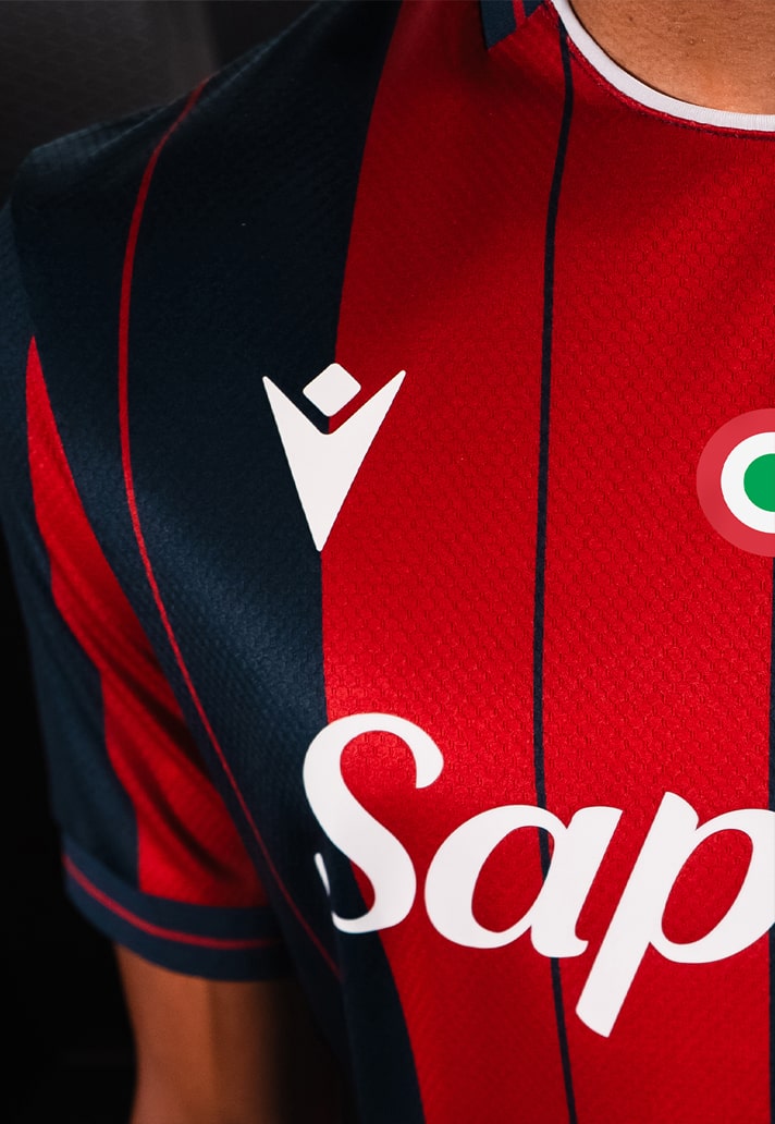 Now into their twenty-fifth consecutive season together — a landmark few clubs or brands can match — Bologna and Macron have dropped a new home shirt that does more than honour a long-standing partnership. This one celebrates a Coppa Italia crown. For the first time in years, the Rossoblù step out with a champions patch sewn proudly on the chest, a golden reminder of the season just passed, nestled between the club crest and the Macron Hero.