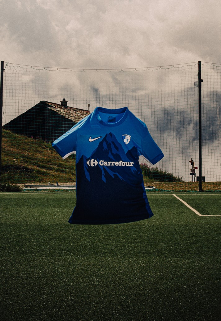Everyone’s heard of the saying “playing to your strengths”. Well if you’re a small club situated at the foot of one of the most famous mountain ranges in Europe, then “playing to your strengths” definitely means leveraging some of the most beautiful backdrops in the world for your kit launches. And so it is that French side Grenoble Foot 38 lean into the poetry of their location once again — this time heading into the mountains themselves to present a design that feels less like a football kit and more like a statement of intent. Where last year’s release campaign paid homage to the spirit of the city, this year the club heads into nature to echo something deeper. Something grander. Something inherently Grenoble.
