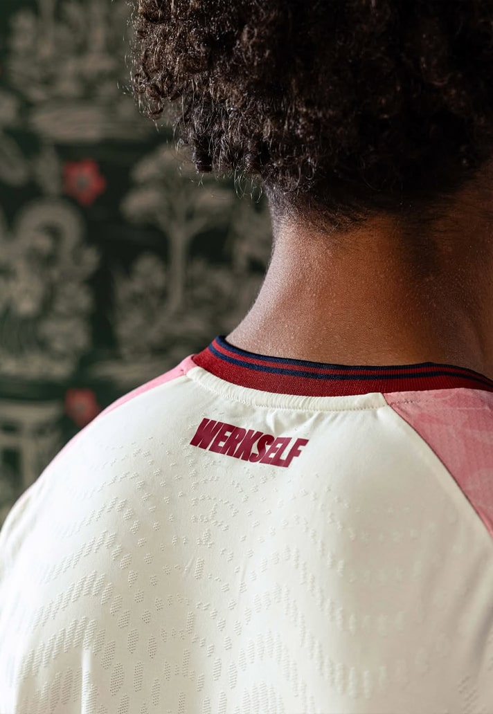 In a season-defining statement, New Balance has delivered a kit that bridges Leverkusen’s dual identity. A bold crimson-to-angora gradient flows through the shirt, an aesthetic embodiment of the club's industrial roots and natural elegance. The deep red bleeds up from the base, evoking the Bayer factory skyline that dominates the city's silhouette, while creamy white tones lighten the mood, nodding to the calm serenity of Leverkusen’s iconic Japanese Garden — one of the oldest and largest of its kind in Europe.